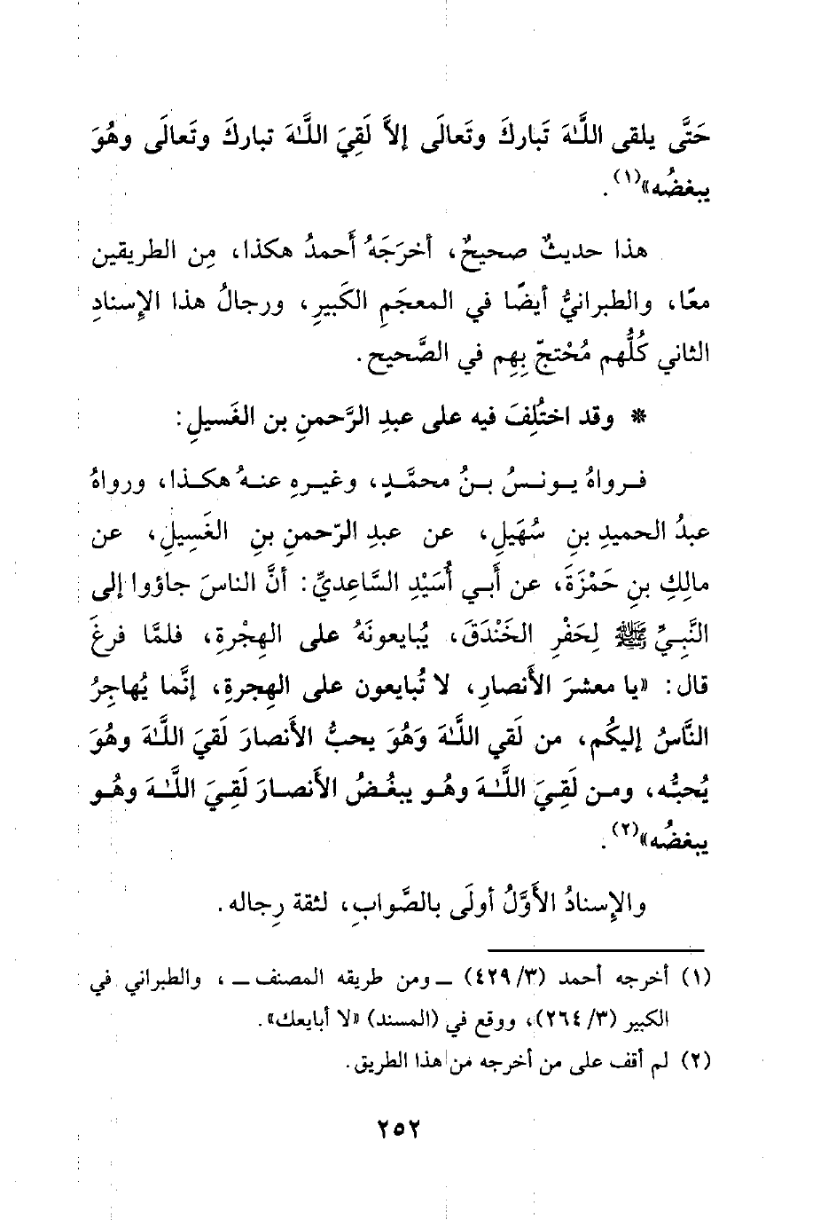 فرواه يونس بن محمدٍ، وغيره عنه هكذا، ورواه عبد الحميد بن سهيل، عن عبد الرحمن بن الغسيل، عن مالك بن حمزة، عن أبي أسيد الساعدي: أن الناس جاءوا إلى النبي صلى الله عليه وسلم لحفر الخندق، يبايعونه على الهجرة، فلما فرغ قال: ((يا معشر الأنصار، لا تبايعون على الهجرة، إنما يهاجر الناس إليكم، من لقي الله وهو يحب الأنصار لقي الله وهو يحبه، ومن لقي الله وهو يبغض الأنصار لقي الله وهو يبغضه)).