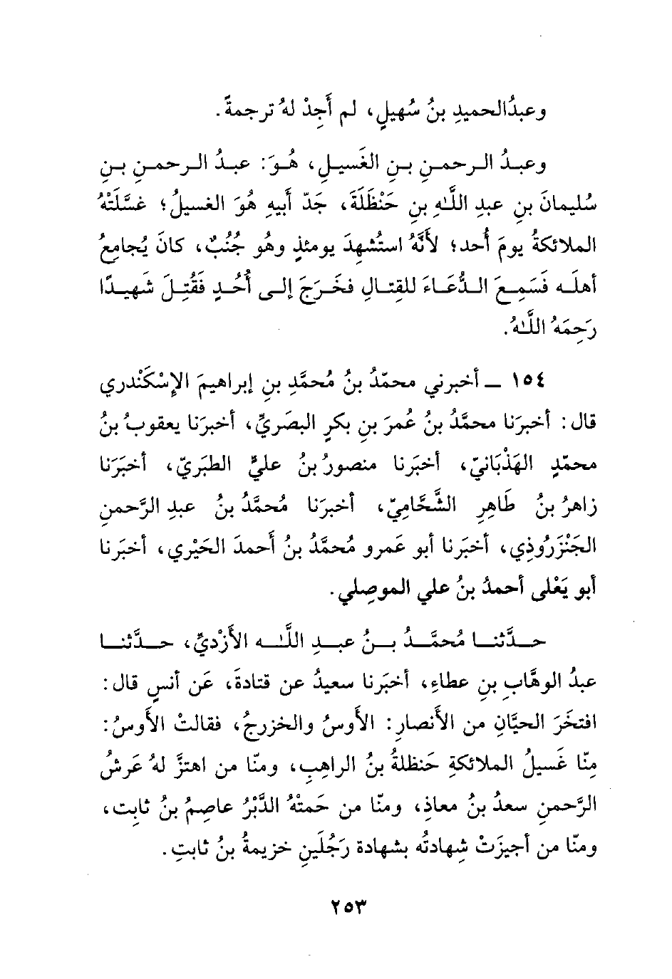 حدثنا محمد بن عبد الله الأزدي، حدثنا عبد الوهاب بن عطاء، أخبرنا سعيد عن قتادة، عن أنس قال: افتخر الحيان من الأنصار: الأوس والخزرج، فقالت الأوس: منا غسيل الملائكة حنظلة بن الراهب، ومنا من اهتز له عرش الرحمن سعد بن معاذ، ومنا من حمته الدبر عاصم بن ثابت، ومنا من أجيزت شهادته بشهادة رجلين خزيمة بن ثابت.