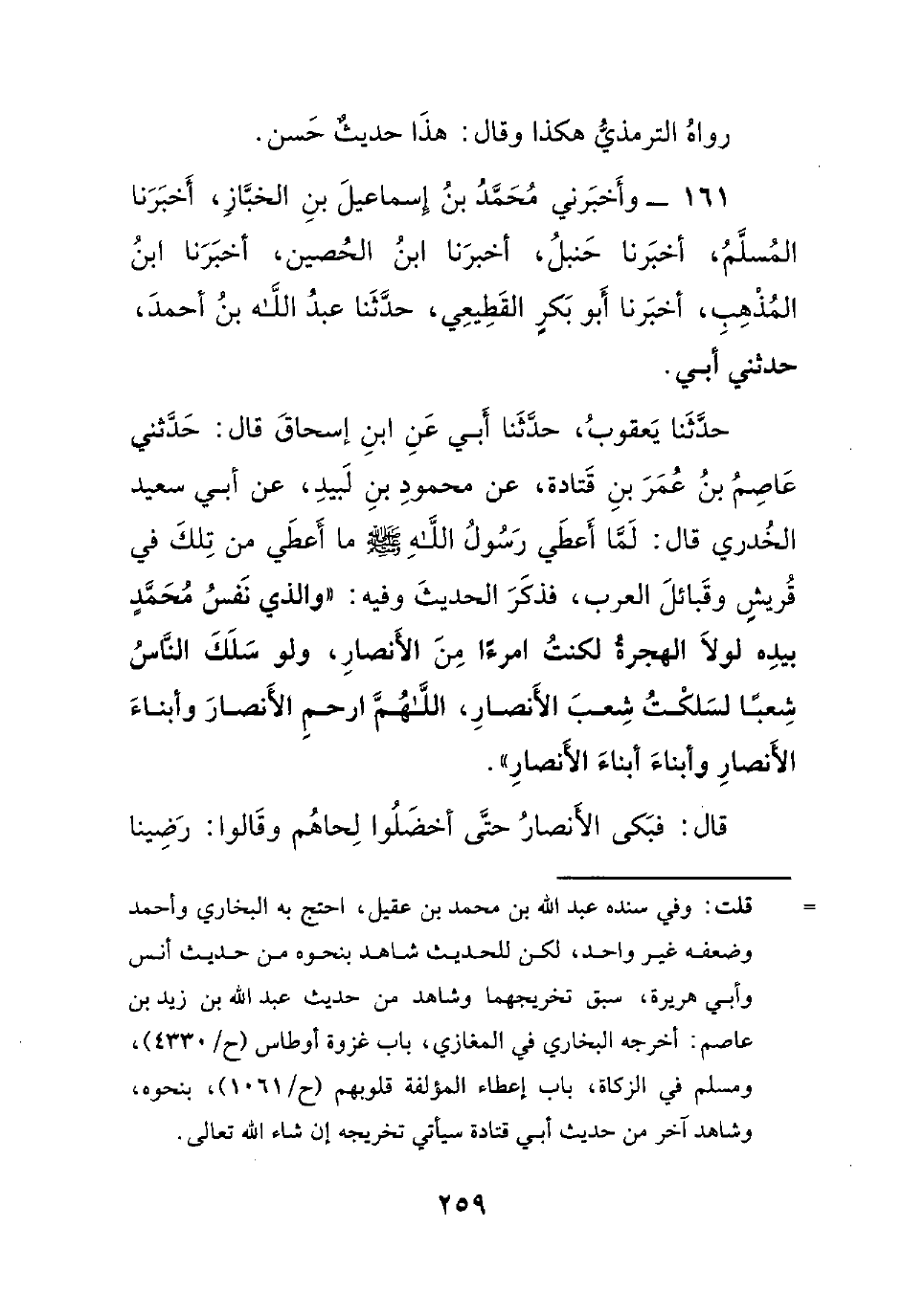 حدثنا يعقوب، حدثنا أبي عن ابن إسحاق قال: حدثني عاصم بن عمر بن قتادة، عن محمود بن لبيد، عن أبي سعيد الخدري قال: لما أعطي رسول الله صلى الله عليه وسلم ما أعطي من تلك في قريشٍ وقبائل العرب، فذكر الحديث وفيه: ((والذي نفس محمدٍ بيده لولا الهجرة لكنت امرءاً من الأنصار، ولو سلك الناس شعباً لسلكت شعب الأنصار، اللهم ارحم الأنصار وأبناء الأنصار وأبناء أبناء الأنصار)).