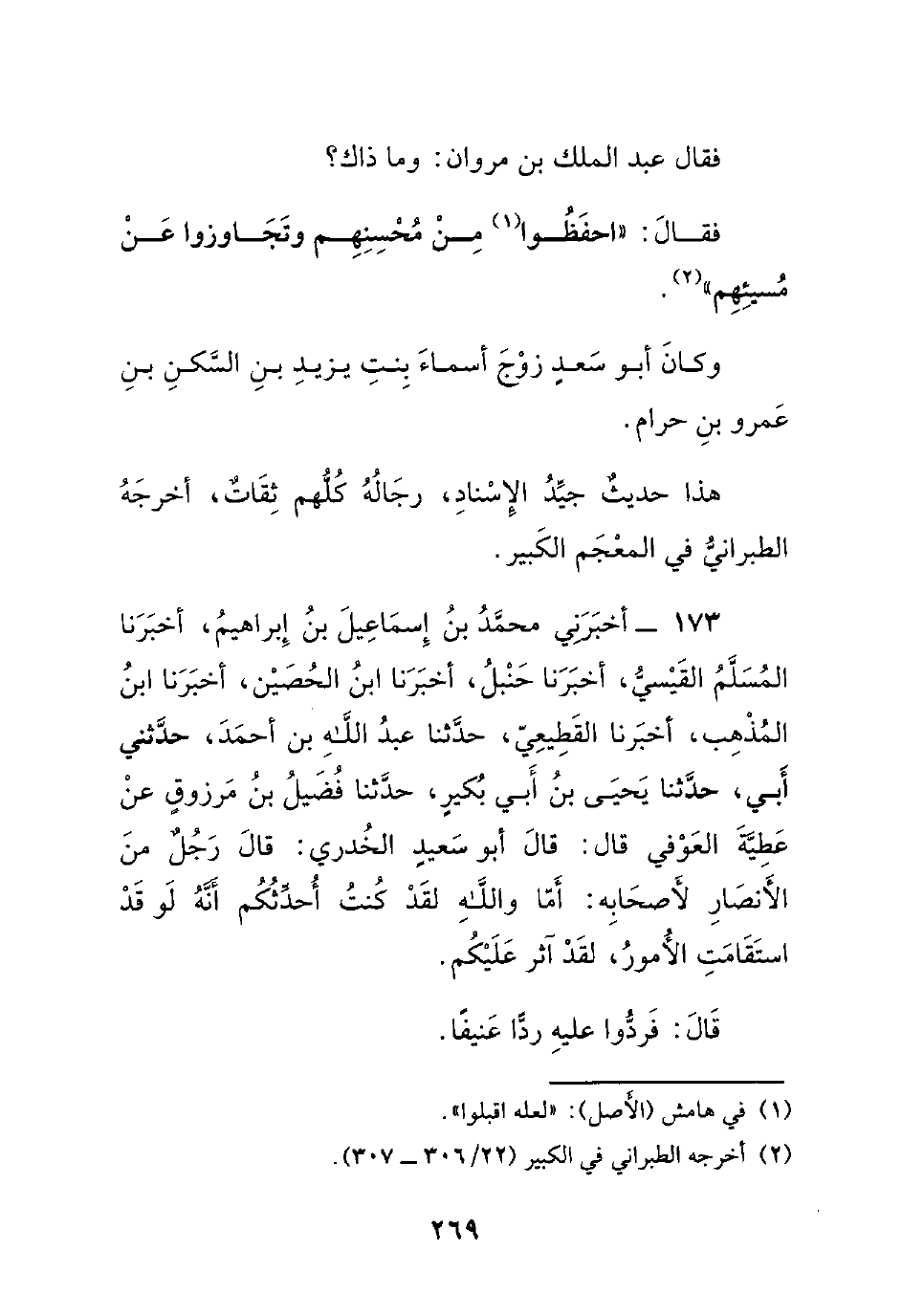 173- أخبرني محمد بن إسماعيل بن إبراهيم، أخبرنا المسلم القيسي، أخبرنا حنبل، أخبرنا ابن الحصين، أخبرنا ابن المذهب، أخبرنا القطيعي، حدثنا عبد الله بن أحمد، حدثني أبي، حدثنا يحيى بن أبي بكيرٍ، حدثنا فضيل بن مرزوقٍ عن عطية العوفي قال: قال أبو سعيدٍ الخدري: قال رجلٌ من الأنصار لأصحابه: أما والله لقد كنت أحدثكم أنه لو قد استقامت الأمور، لقد آثر عليكم.