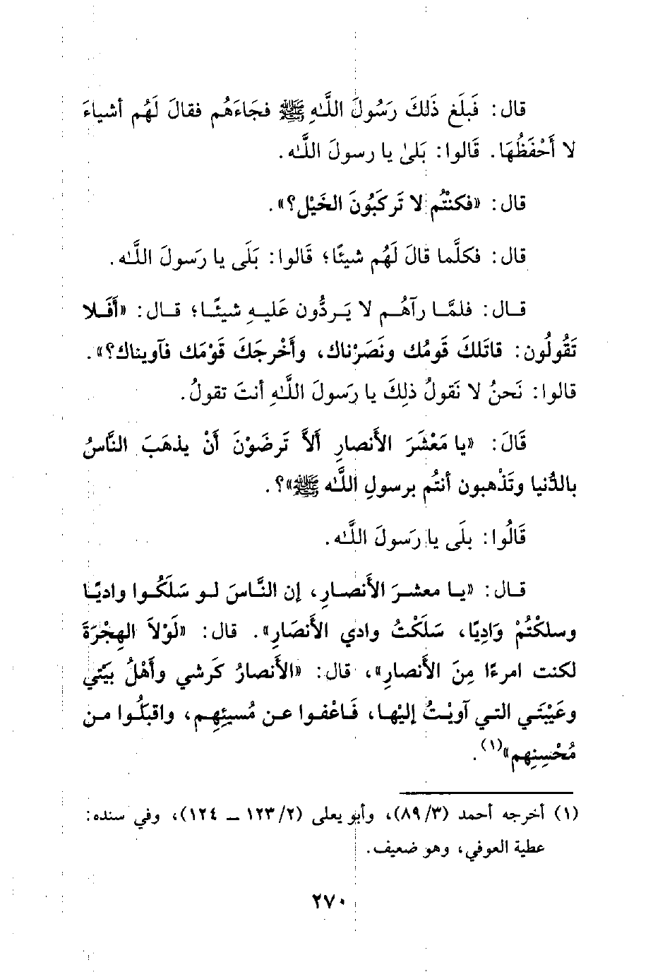 قال: ((يا معشر الأنصار، إن الناس لو سلكوا وادياً وسلكتم وادياً، سلكت وادي الأنصار)). قال: ((لولا الهجرة لكنت امرءاً من الأنصار))، قال: ((الأنصار كرشي وأهل بيتي وعيبتي التي آويت إليها، فاعفوا عن مسيئهم، واقبلوا من محسنهم)).