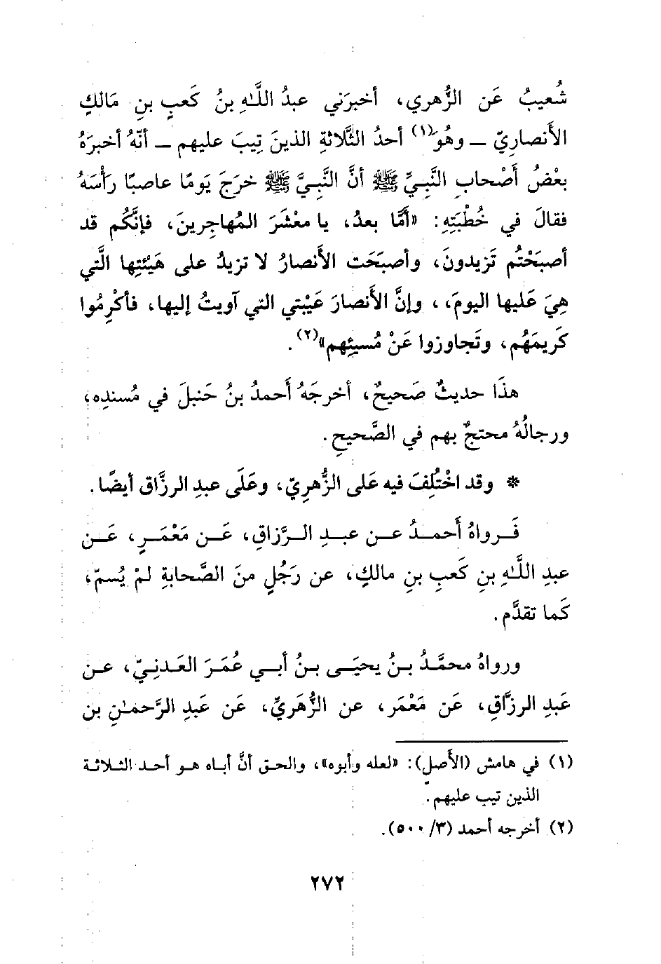 شعيب عن الزهري، أخبرني عبد الله بن كعبٍ بن مالكٍ الأنصاري -وهو أحد الثلاثة الذين تيب عليهم- أنه أخبره بعض أصحاب النبي صلى الله عليه وسلم أن النبي صلى الله عليه وسلم خرج يوماً عاصباً رأسه فقال في خطبته: ((أما بعد، يا معشر المهاجرين، فإنكم قد أصبحتم تزيدون، وأصبحت الأنصار لا تزيد على هيئتها التي هي عليها اليوم، وإن الأنصار عيبتي التي آويت إليها، فأكرموا كريمهم، وتجاوزوا عن مسيئهم)).