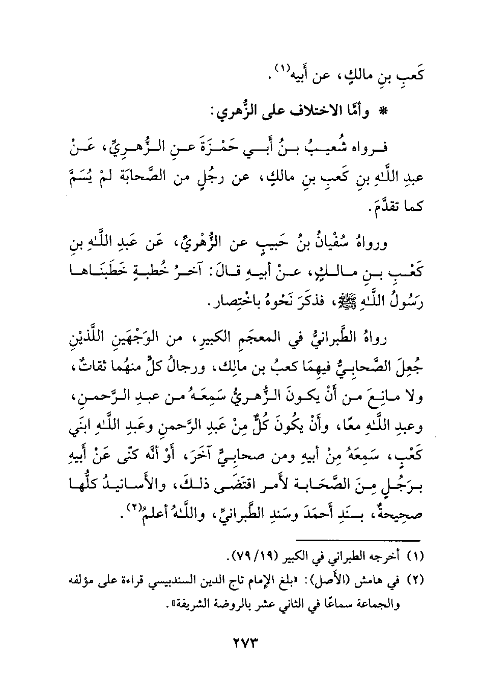 رواه الطبراني في المعجم الكبير، من الوجهين اللذين جعل الصحابي فيهما كعب بن مالك، ورجال كل منهما ثقاتٌ، ولا مانع من أن يكون الزهري سمعه من عبد الرحمن، وعبد الله معاً، وأن يكون كلٌ من عبد الرحمن وعبد الله ابني كعبٍ، سمعه من أبيه ومن صحابيٍ آخر، أو أنه كنى عن أبيه برجلٍ من الصحابة لأمر اقتضى ذلك، والأسانيد كلها صحيحةٌ، بسند أحمد وسند الطبراني، والله أعلم.