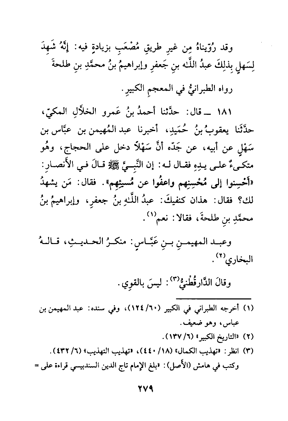 181-قال: حدثنا أحمد بن عمرو الخلال المكي، حدثنا يعقوب بن حميد، أخبرنا عبد المهيمن بن عباس بن سهلٍ عن أبيه، عن جده أن سهلاً دخل على الحجاج، وهو متكئٌ على يده فقال له: إن النبي صلى الله عليه وسلم قال في الأنصار: ((أحسنوا إلى محسنهم واعفوا عن مسيئهم)). فقال: من يشهد لك؟ فقال: هذان كنفيك: عبد الله بن جعفر، وإبراهيم بن محمد بن طلحة، فقالا: نعم.