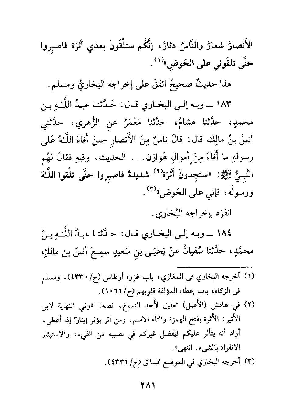 183- وبه إلى البخاري قال: حدثنا عبد الله بن محمدٍ، حدثنا هشام، حدثنا معمر عن الزهري، حدثني أنس بن مالك قال: قال ناسٌ من الأنصار حين أفاء الله على رسوله ما أفاء من أموال هوازن.. .. الحديث، وفيه فقال لهم النبي صلى الله عليه وسلم : ((ستجدون أثرة شديدةً فاصبروا حتى تلقوا الله ورسوله، فإني على الحوض)).
