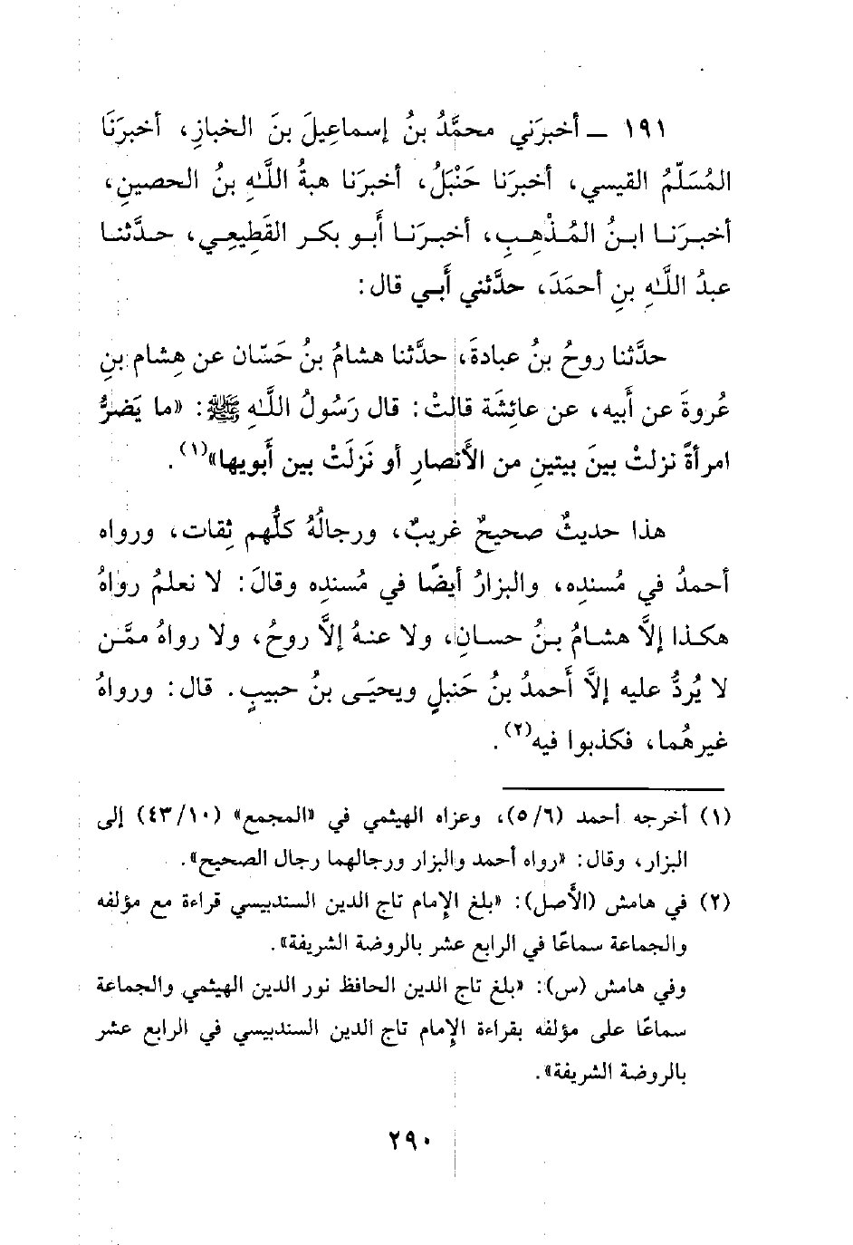 191- أخبرني محمد بن إسماعيل بن الخباز، أخبرنا المسلم القيسي، أخبرنا حنبل، أخبرنا هبة الله بن الحصين، أخبرنا ابن المذهب، أخبرنا أبو بكر القطيعي، حدثنا عبد الله بن أحمد، حدثني أبي قال: