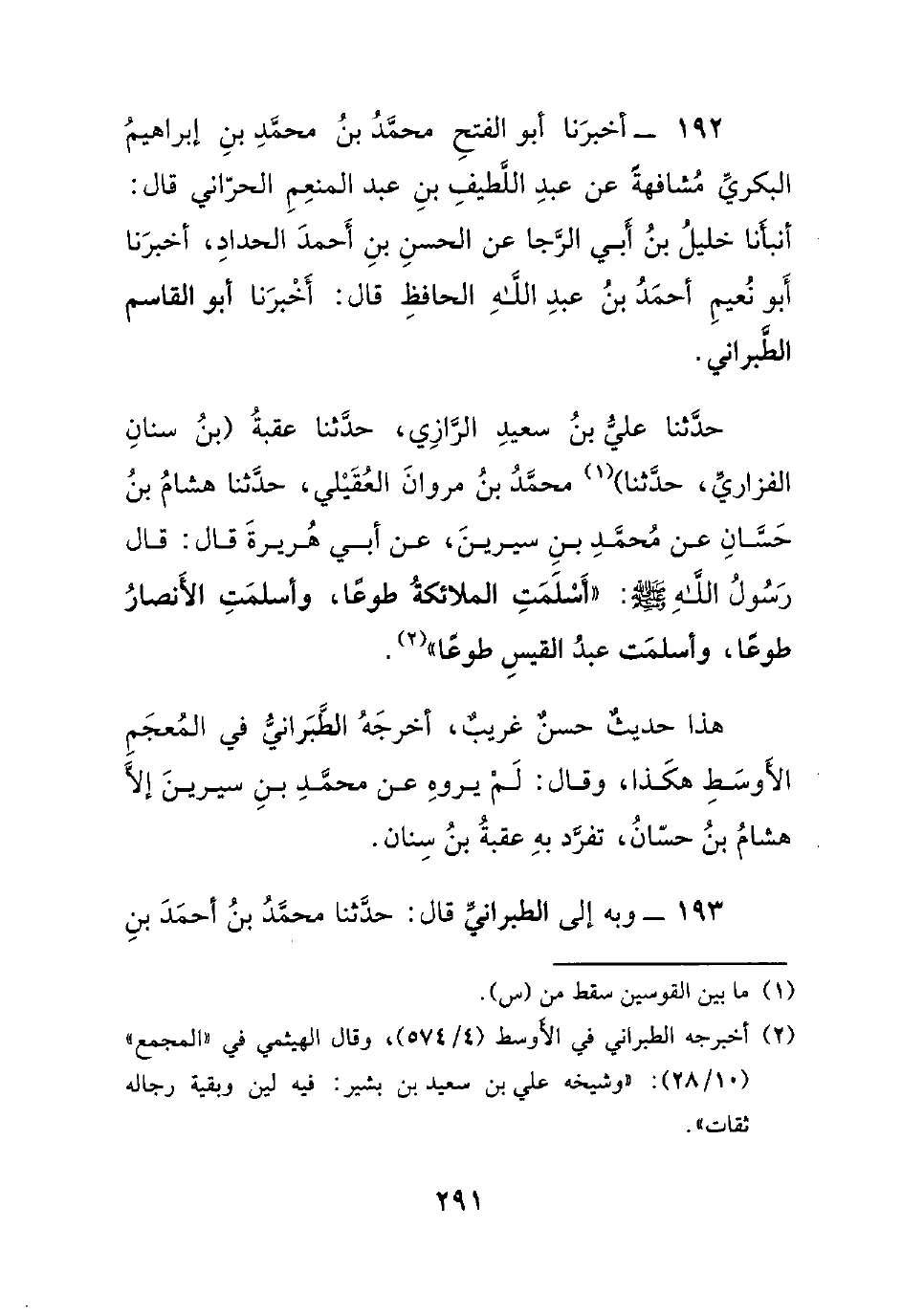 192- أخبرنا أبو الفتح محمد بن محمد بن إبراهيم البكري مشافهةً عن عبد اللطيف بن عبد المنعم الحراني قال: أنبأنا خليل بن أبي الرجا عن الحسن بن أحمد الحداد، أخبرنا أبو نعيم أحمد بن عبد الله الحافظ قال: أخبرنا أبو القاسم الطبراني.