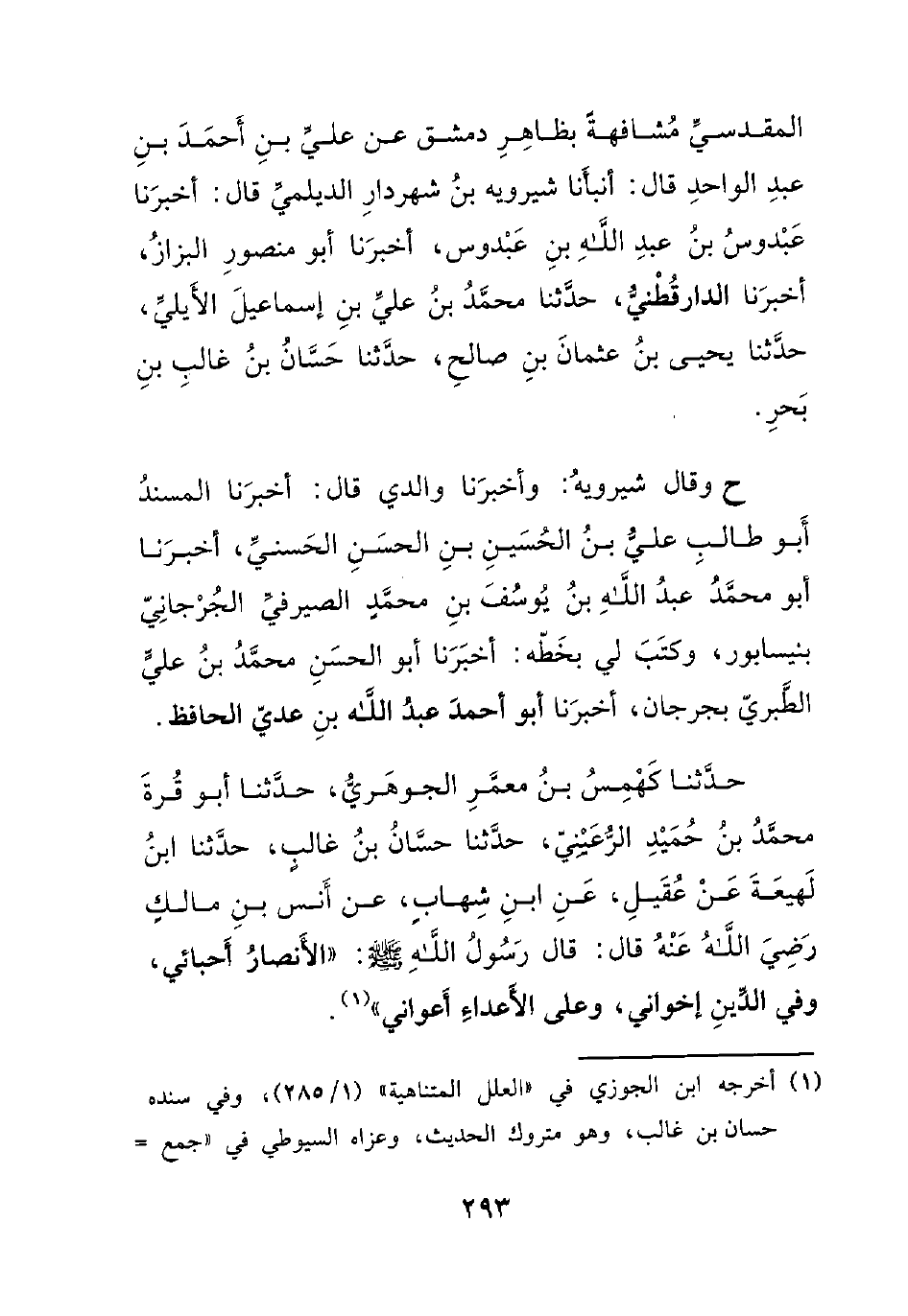 المقدسي مشافهةً بظاهر دمشق عن علي بن أحمد بن عبد الواحد قال: أنبأنا شيرويه بن شهردار الديلمي قال: أخبرنا عبدوس بن عبد الله بن عبدوس، أخبرنا أبو منصور البزاز، أخبرنا الدارقطني، حدثنا محمد بن علي بن إسماعيل الأيلي، حدثنا يحيى بن عثمان بن صالح، حدثنا حسان بن غالب بن بحر.