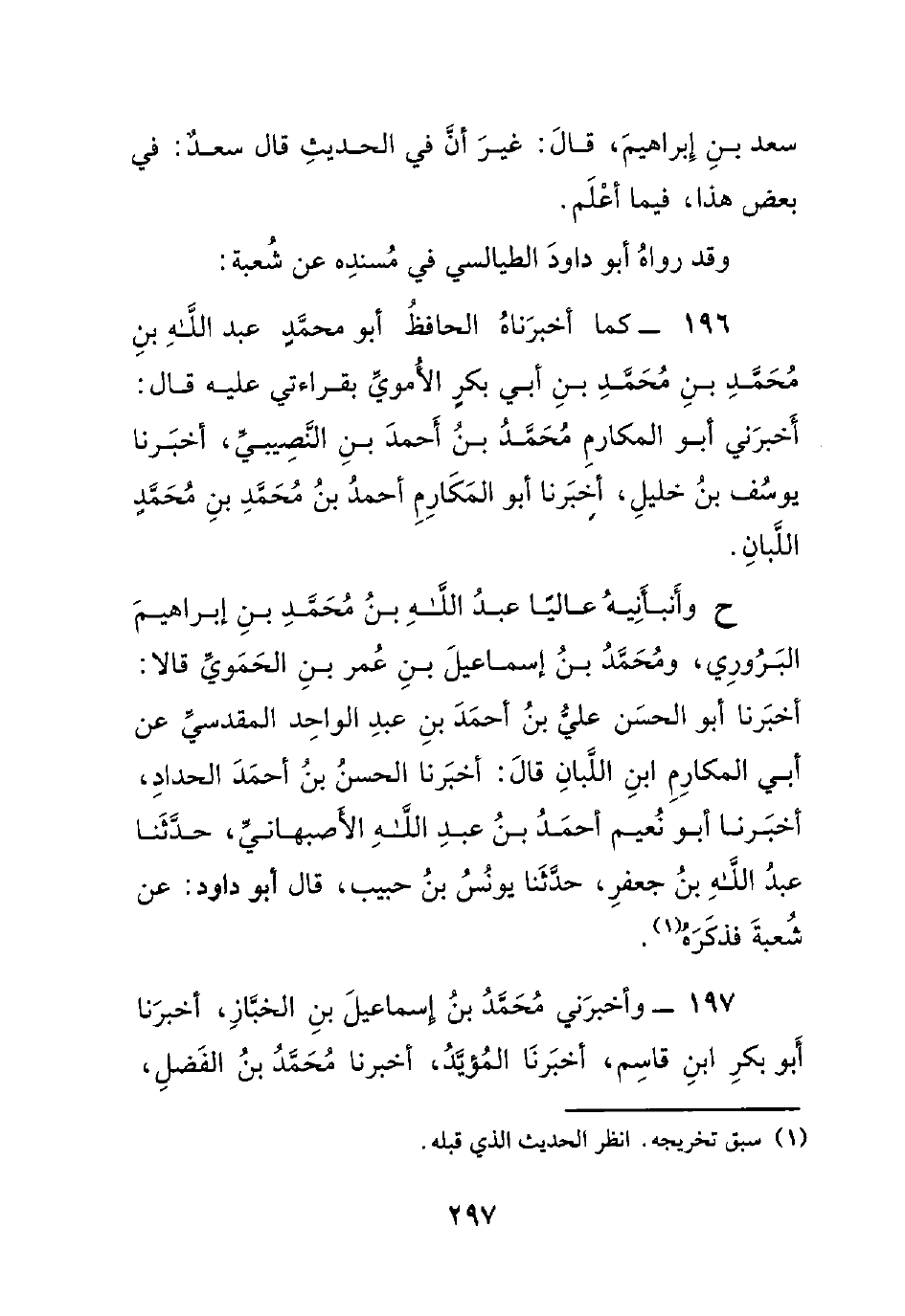 196- كما أخبرناه الحافظ أبو محمدٍ عبد الله بن محمد بن محمد بن أبي بكر الأموي بقراءتي عليه قال: أخبرني أبو المكارم محمد بن أحمد بن النصيبي، أخبرنا يوسف بن خليل، أخبرنا أبو المكارم أحمد بن محمد بن محمدٍ اللبان.