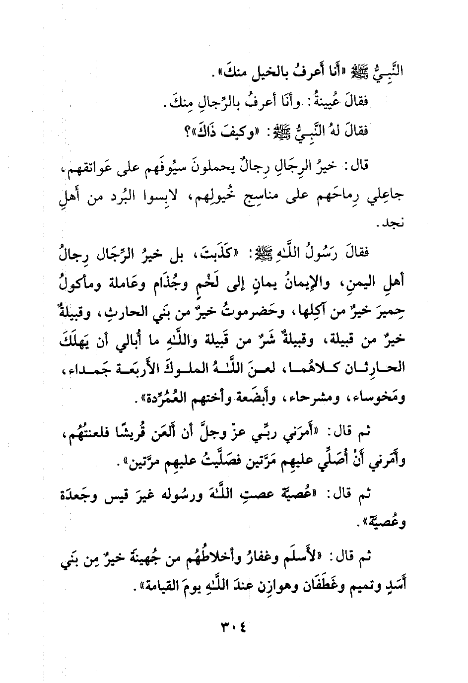 قال: خير الرجال رجالٌ يحملون سيوفهم على عواتقهم، جاعلي رماحهم على مناسج خيولهم، لابسوا البرد من أهل نجد.