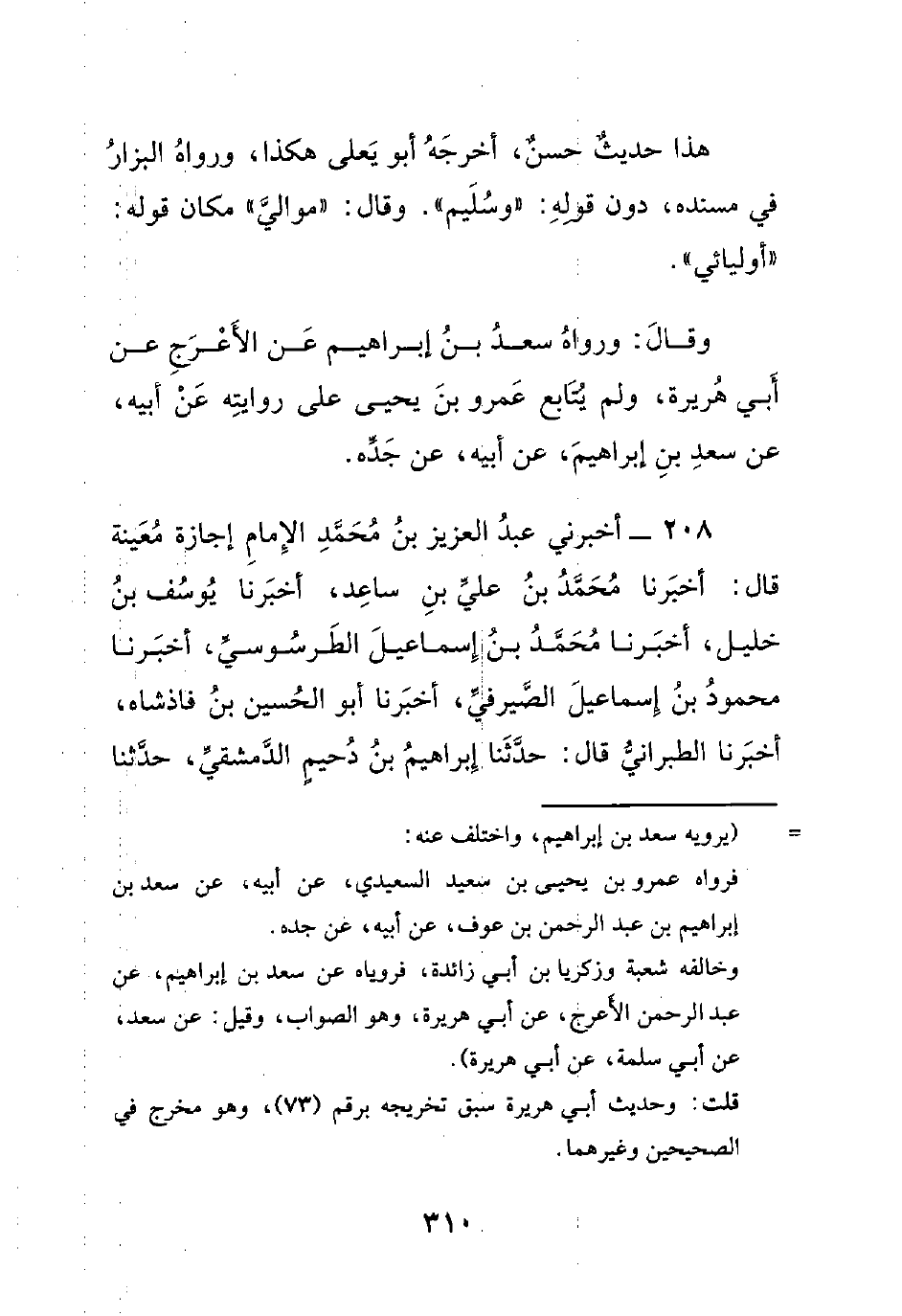 208- أخبرني عبد العزيز بن محمد الإمام إجازة معينة قال: أخبرنا محمد بن علي بن ساعد، أخبرنا يوسف بن خليل، أخبرنا محمد بن إسماعيل الطرسوسي، أخبرنا محمود بن إسماعيل الصيرفي، أخبرنا أبو الحسين بن فاذشاه، أخبرنا الطبراني قال: حدثنا إبراهيم بن دحيمٍ الدمشقي، حدثنا