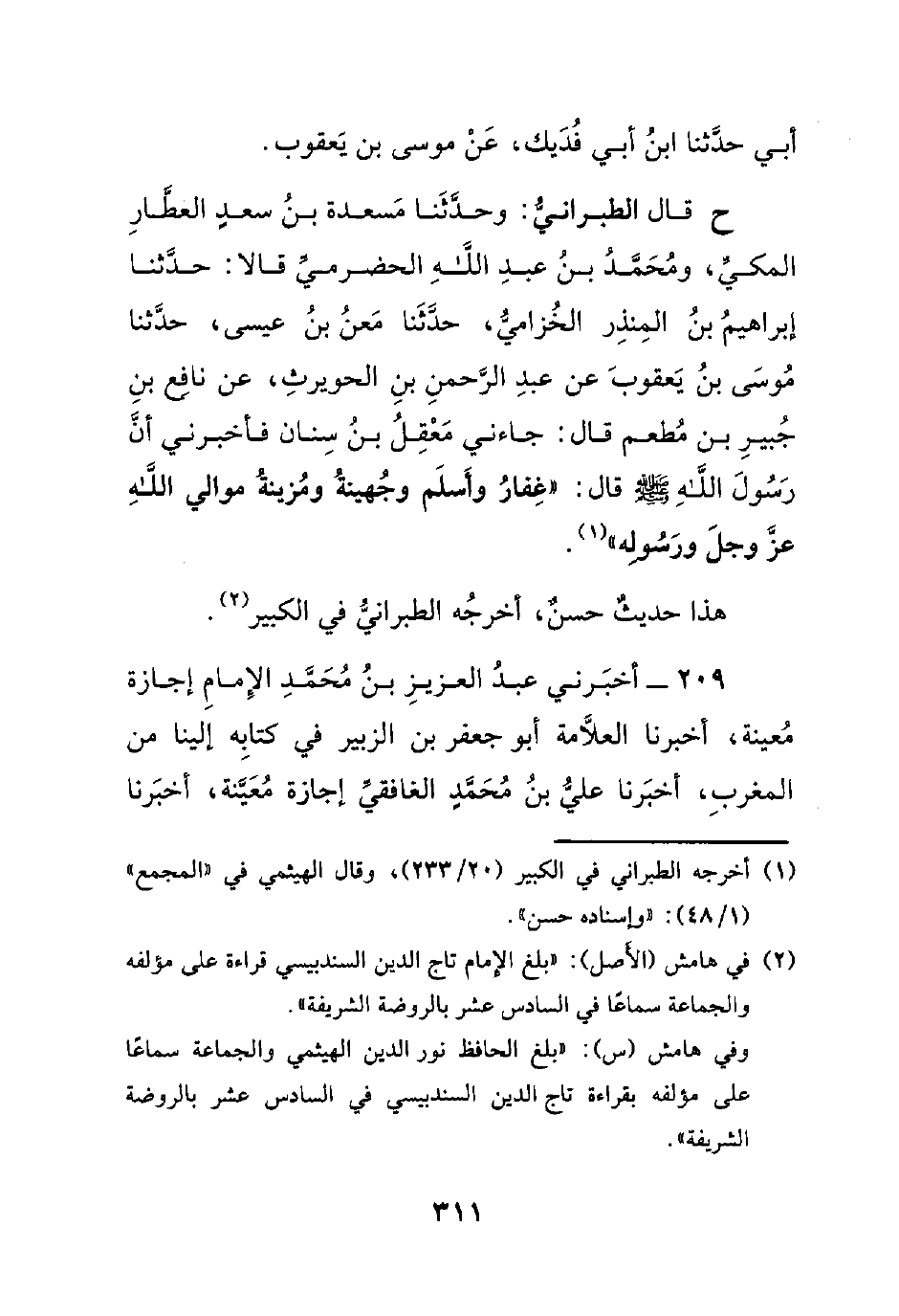 209- أخبرني عبد العزيز بن محمد الإمام إجازة معينة، أخبرنا العلامة أبو جعفر بن الزبير في كتابه إلينا من المغرب، أخبرنا علي بن محمدٍ الغافقي إجازة معينة، أخبرنا