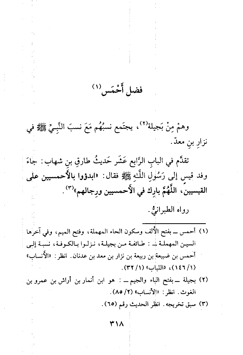 تقدم في الباب الرابع عشر حديث طارق بن شهاب: جاء وفد قيس إلى رسول الله صلى الله عليه وسلم فقال: ((ابدؤوا بالأحمسيين على القيسيين، اللهم بارك في الأحمسيين ورجالهم)).