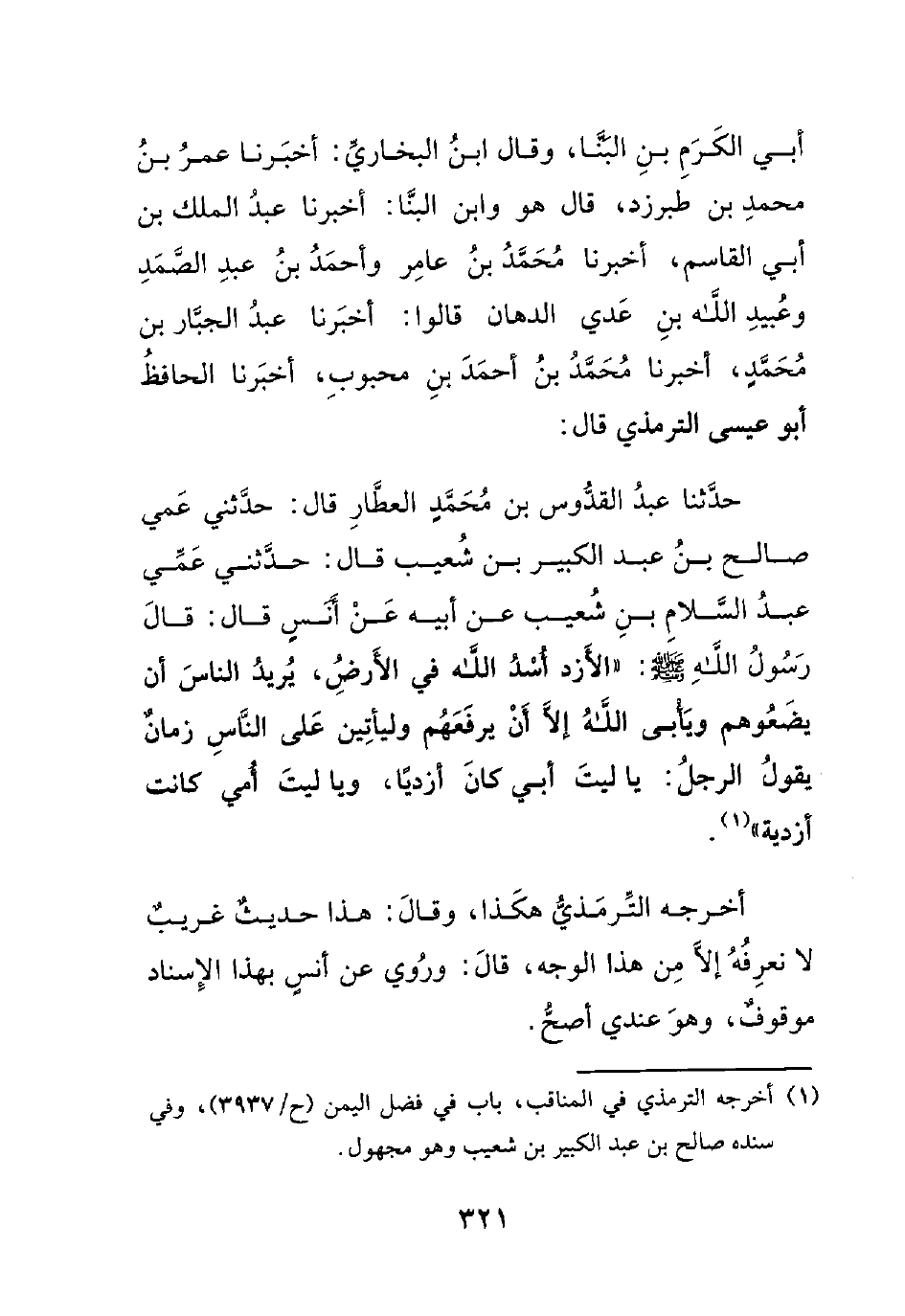 حدثنا عبد القدوس بن محمد العطار قال: حدثني عمي صالح بن عبد الكبير بن شعيب قال: حدثني عمي عبد السلام بن شعيب عن أبيه عن أنسٍ قال: قال رسول الله صلى الله عليه وسلم : ((الأزد أسد الله في الأرض، يريد الناس أن يضعوهم ويأبى الله إلا أن يرفعهم وليأتين على الناس زمانٌ يقول الرجل: يا ليت أبي كان أزدياً، ويا ليت أمي كانت أزدية)).
