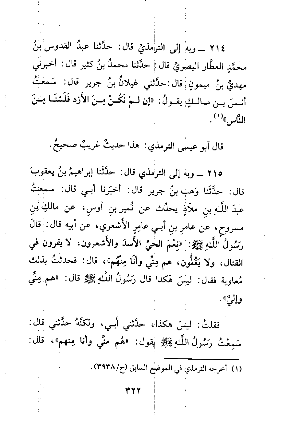 214- وبه إلى الترمذي قال: حدثنا عبد القدوس بن محمد العطار البصري قال: حدثنا محمد بن كثير قال: أخبرني مهدي بن ميمونٍ قال: حدثني غيلان بن جرير قال: سمعت أنس بن مالكٍ يقول: ((إن لم نكن من الأزد فلسنا من الناس)).