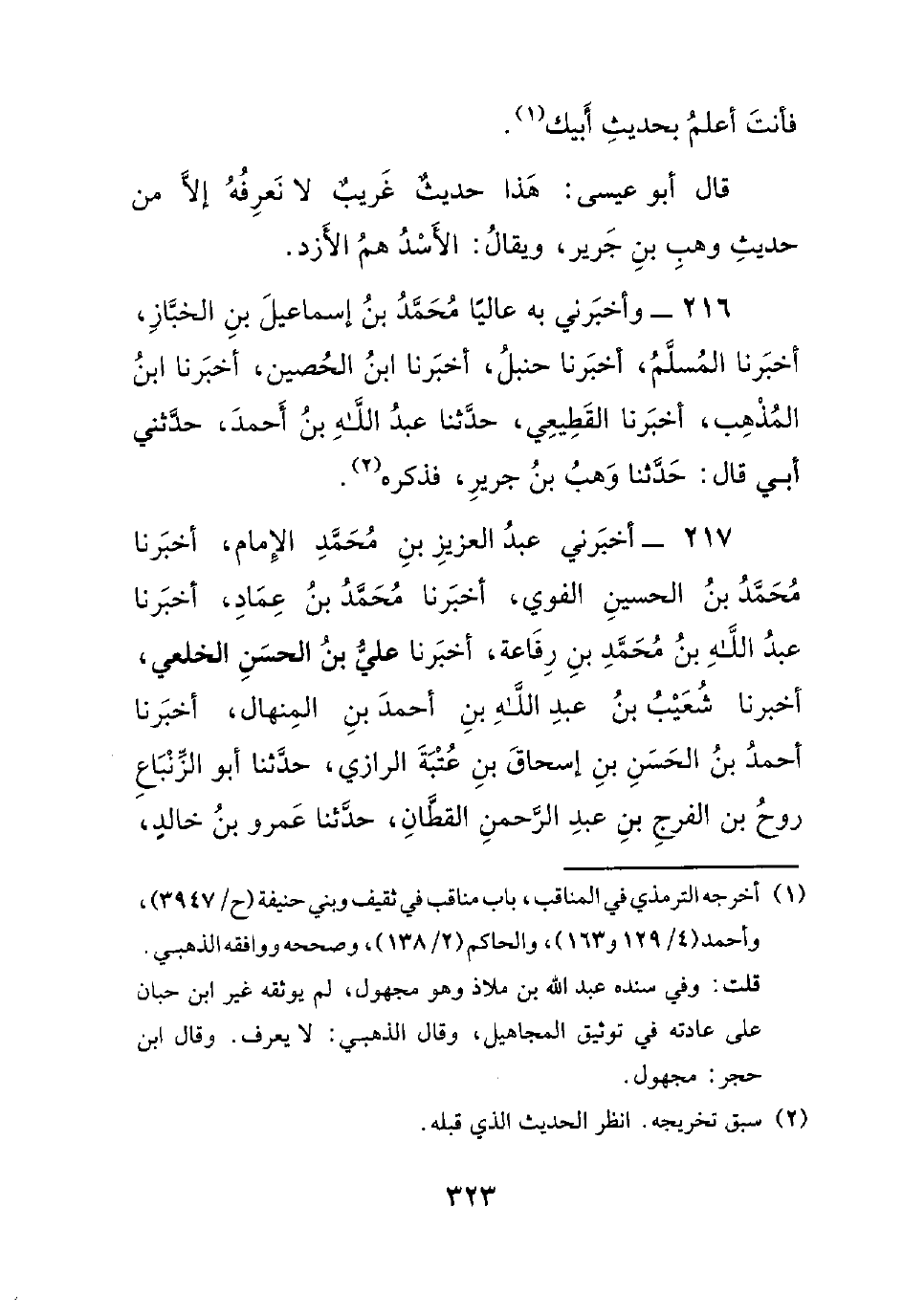 216- وأخبرني به عالياً محمد بن إسماعيل بن الخباز، أخبرنا المسلم، أخبرنا حنبل، أخبرنا ابن الحصين، أخبرنا ابن المذهب، أخبرنا القطيعي، حدثنا عبد الله بن أحمد، حدثني أبي قال: حدثنا وهب بن جرير، فذكره.