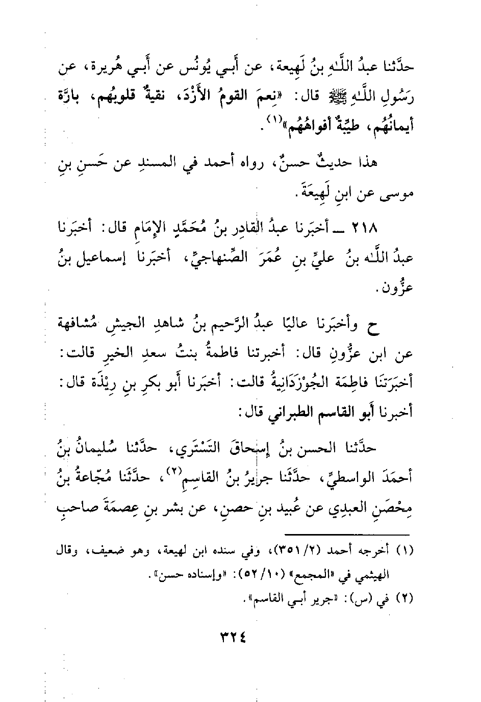 حدثنا عبد الله بن لهيعة، عن أبي يونس عن أبي هريرة، عن رسول الله صلى الله عليه وسلم قال: ((نعم القوم الأزد، نقيةٌ قلوبهم، بارة أيمانهم، طيبةٌ أفواههم)).