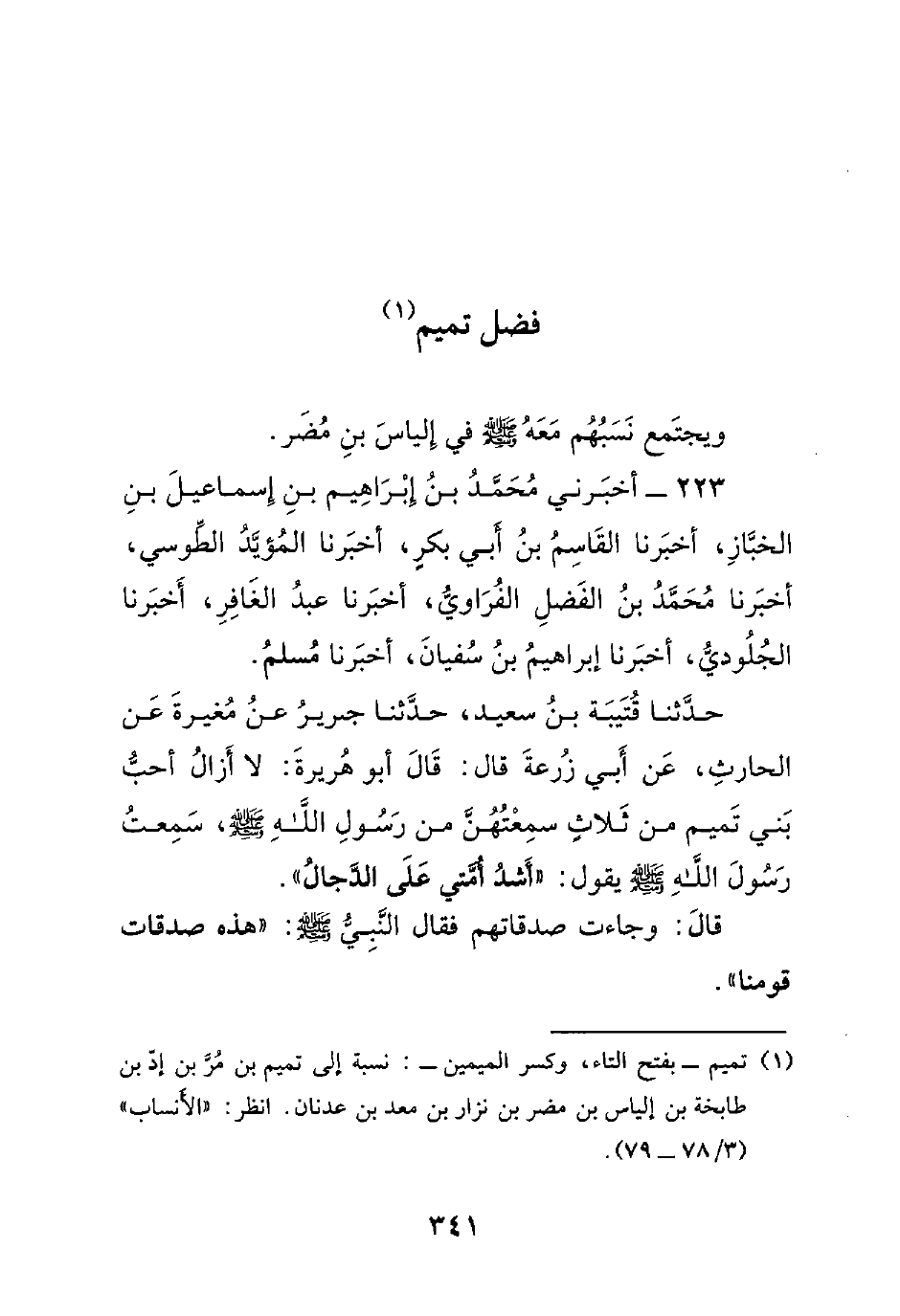 حدثنا قتيبة بن سعيد، حدثنا جرير عن مغيرة عن الحارث، عن أبي زرعة قال: قال أبو هريرة: لا أزال أحب بني تميم من ثلاثٍ سمعتهن من رسول الله صلى الله عليه وسلم ، سمعت رسول الله صلى الله عليه وسلم يقول: ((أشد أمتي على الدجال)).