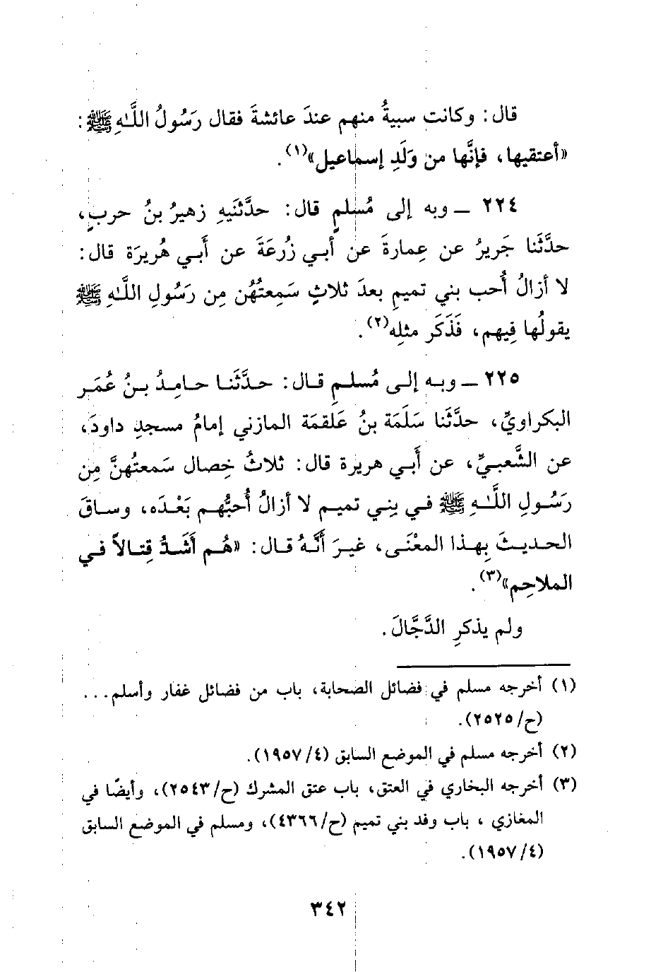 224- وبه إلى مسلمٍ قال: حدثنيه زهير بن حربٍ، حدثنا جرير عن عمارة عن أبي زرعة عن أبي هريرة قال: لا أزال أحب بني تميم بعد ثلاثٍ سمعتهن من رسول الله صلى الله عليه وسلم يقولها فيهم، فذكر مثله.