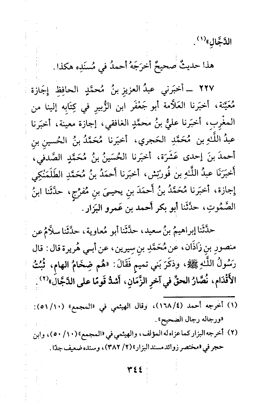 227- أخبرني عبد العزيز بن محمدٍ الحافظ إجازة معينة، أخبرنا العلامة أبو جعفر ابن الزبير في كتابه إلينا من المغرب، أخبرنا علي بن محمدٍ الغافقي، إجازة معينة، أخبرنا عبد الله بن محمد الحجري، أخبرنا محمد بن الحسين بن أحمد بن إحدى عشرة، أخبرنا الحسين بن محمدٍ الصدفي، أخبرنا عبد الله بن فورتش، أخبرنا أحمد بن محمد الطلمنكي إجازة، أخبرنا محمد بن أحمد بن يحيى بن مفرجٍ، حدثنا ابن الصموت، حدثنا أبو بكر أحمد بن عمرو البزار.