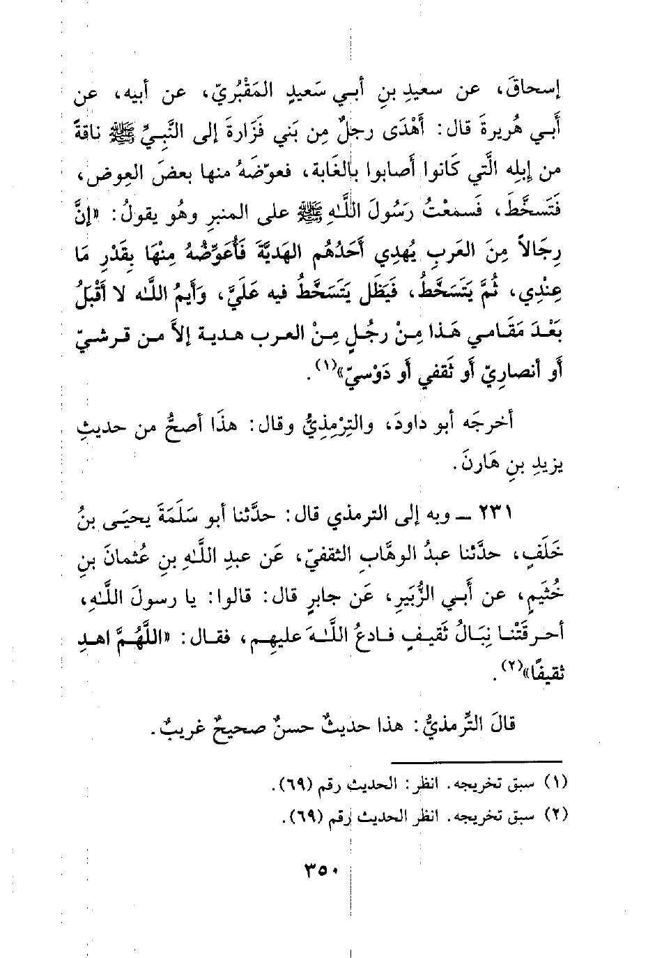 إسحاق، عن سعيد بن أبي سعيدٍ المقبري، عن أبيه، عن أبي هريرة قال: أهدى رجلٌ من بني فزارة إلى النبي صلى الله عليه وسلم ناقةً من إبله التي كانوا أصابوا بالغابة، فعوضه منها بعض العوض، فتسخط، فسمعت رسول الله صلى الله عليه وسلم على المنبر وهو يقول: ((إن رجالاً من العرب يهدي أحدهم الهدية فأعوضه منها بقدر ما عندي، ثم يتسخط، فيظل يتسخط فيه علي، وأيم الله لا أقبل بعد مقامي هذا من رجلٍ من العرب هدية إلا من قرشي أو أنصاري أو ثقفي أو دوسي)).