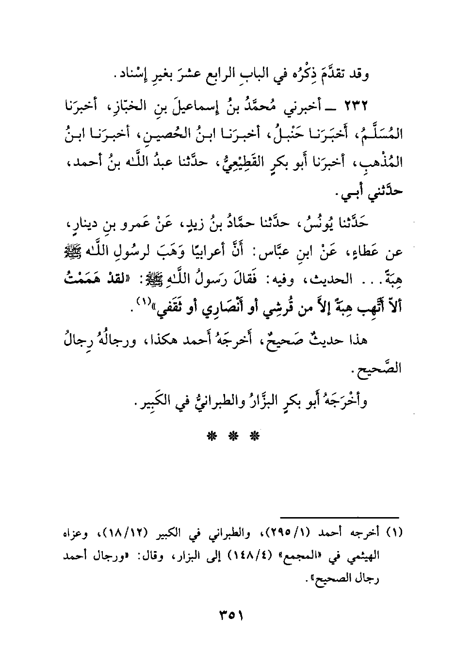 232- أخبرني محمد بن إسماعيل بن الخباز، أخبرنا المسلم، أخبرنا حنبل، أخبرنا ابن الحصين، أخبرنا ابن المذهب، أخبرنا أبو بكرٍ القطيعي، حدثنا عبد الله بن أحمد، حدثني أبي.