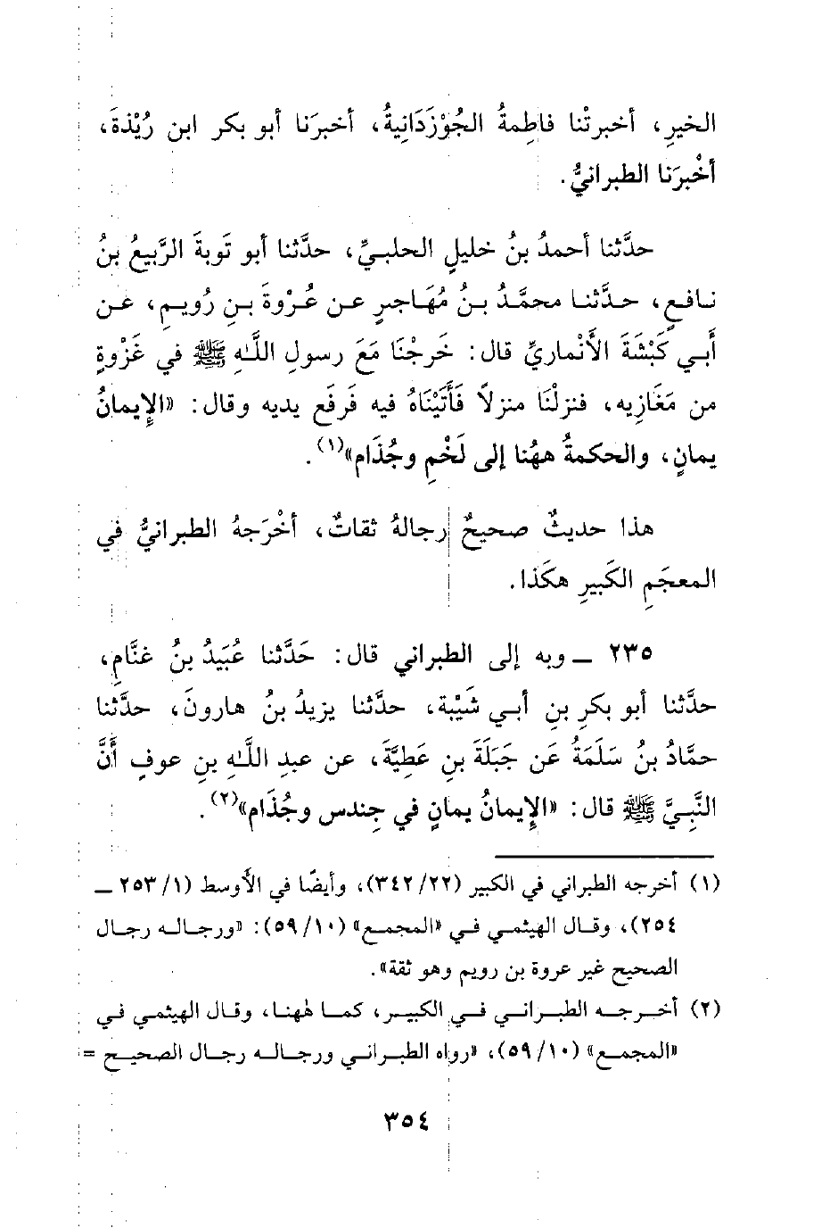 حدثنا أحمد بن خليل الحلبي، حدثنا أبو توبة الربيع بن نافعٍ، حدثنا محمد بن مهاجرٍ عن عروة بن رويم، عن أبي كبشة الأنماري قال: خرجنا مع رسول الله صلى الله عليه وسلم في غزوةٍ من مغازيه، فنزلنا منزلاً فأتيناه فيه فرفع يديه وقال: ((الإيمان يمانٍ، والحكمة ههنا إلى لخمٍ وجذام)).