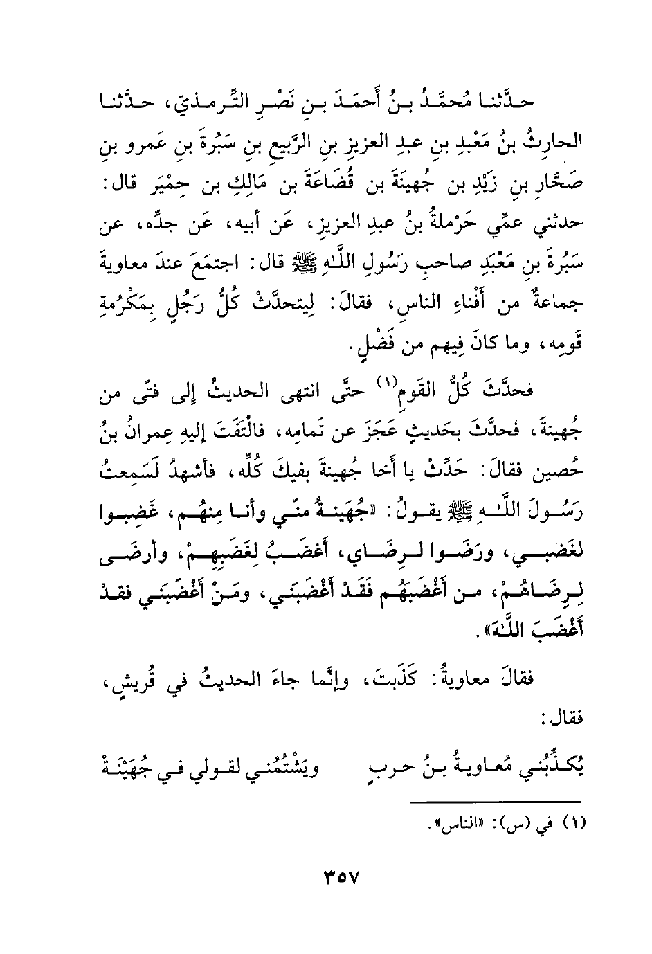 حدثنا محمد بن أحمد بن نصر الترمذي، حدثنا الحارث بن معبد بن عبد العزيز بن الربيع بن سبرة بن عمرو بن صحار بن زيد بن جهينة بن قضاعة بن مالك بن حمير قال: حدثني عمي حرملة بن عبد العزيز، عن أبيه، عن جده، عن سبرة بن معبد صاحب رسول الله صلى الله عليه وسلم قال: اجتمع عند معاوية جماعةٌ من أفناء الناس، فقال: ليتحدث كل رجلٍ بمكرمة قومه، وما كان فيهم من فضلٍ.