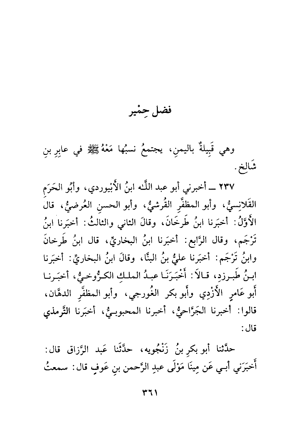 237- أخبرني أبو عبد الله ابن الأبيوردي، وأبو الحرم القلانسي، وأبو المظفر القرشي، وأبو الحسن العرضي، قال الأول: أخبرنا ابن طرخان، وقال الثاني والثالث: أخبرنا ابن ترجم، وقال الرابع: أخبرنا ابن البخاري، قال ابن طرخان وابن ترجم: أخبرنا علي بن البنا، وقال ابن البخاري: أخبرنا ابن طبرزد، قالا: أخبرنا عبد الملك الكروخي، أخبرنا أبو عامر الأزدي وأبو بكر الغورجي، وأبو المظفر الدهان، قالوا: أخبرنا الجراحي، أخبرنا المحبوبي، أخبرنا الترمذي قال: