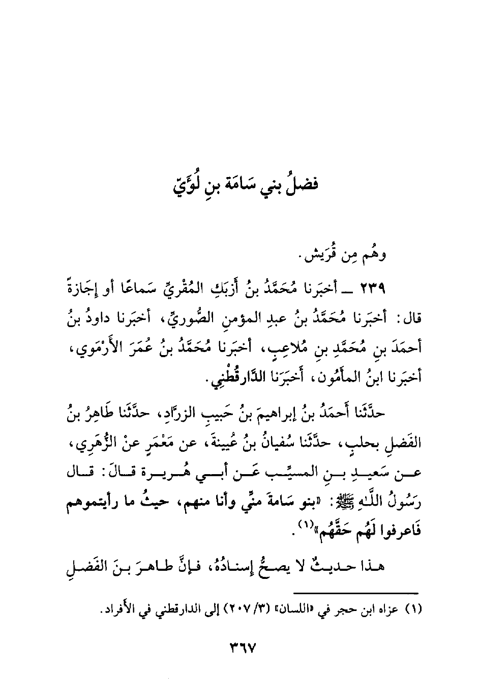 حدثنا أحمد بن إبراهيم بن حبيب الزراد، حدثنا طاهر بن الفضل بحلبٍ، حدثنا سفيان بن عيينة، عن معمرٍ عن الزهري، عن سعيد بن المسيب عن أبي هريرة قال: قال رسول الله صلى الله عليه وسلم : ((بنو سامة مني وأنا منهم، حيث ما رأيتموهم فاعرفوا لهم حقهم)).