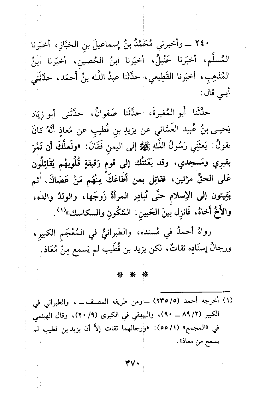 240- وأخبرني محمد بن إسماعيل بن الخباز، أخبرنا المسلم، أخبرنا حنبل، أخبرنا ابن الحصين، أخبرنا ابن المذهب، أخبرنا القطيعي، حدثنا عبد الله بن أحمد، حدثني أبي قال: