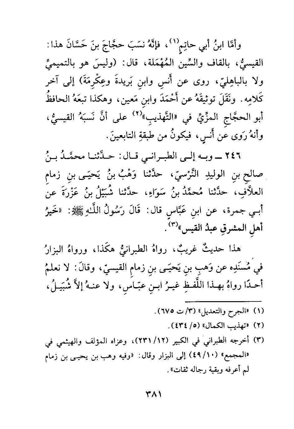 246- وبه إلى الطبراني قال: حدثنا محمد بن صالح بن الوليد النرسي، حدثنا وهب بن يحيى بن زمام العلاف، حدثنا محمد بن سواء، حدثنا شبيل بن عزرة عن أبي جمرة، عن ابن عباسٍ قال: قال رسول الله صلى الله عليه وسلم : ((خير أهل المشرق عبد القيس)).