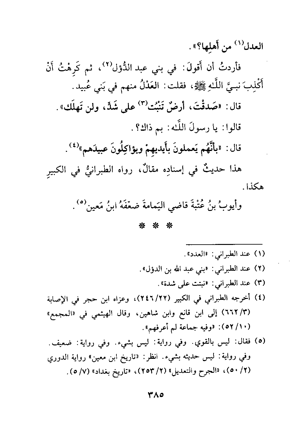فأردت أن أقول: في بني عبد الدؤل، ثم كرهت أن أكذب نبي الله صلى الله عليه وسلم ، فقلت: العدل منهم في بني عبيد.