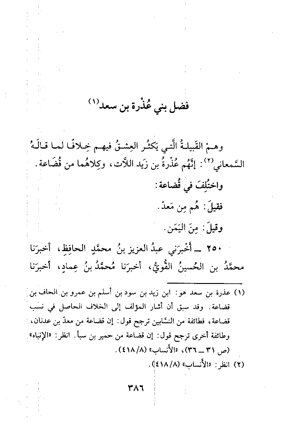 وهم القبيلة التي يكثر العشق فيهم خلافاً لما قاله السمعاني: إنهم عذرة بن زيد اللات، وكلاهما من قضاعة.
