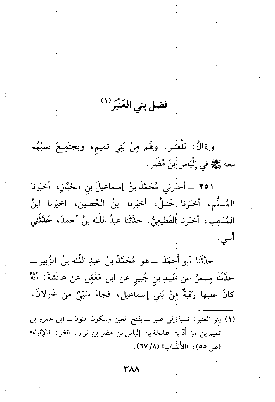 251- أخبرني محمد بن إسماعيل بن الخباز، أخبرنا المسلم، أخبرنا حنبل، أخبرنا ابن الحصين، أخبرنا ابن المذهب، أخبرنا القطيعي، حدثنا عبد الله بن أحمد، حدثني أبي.
