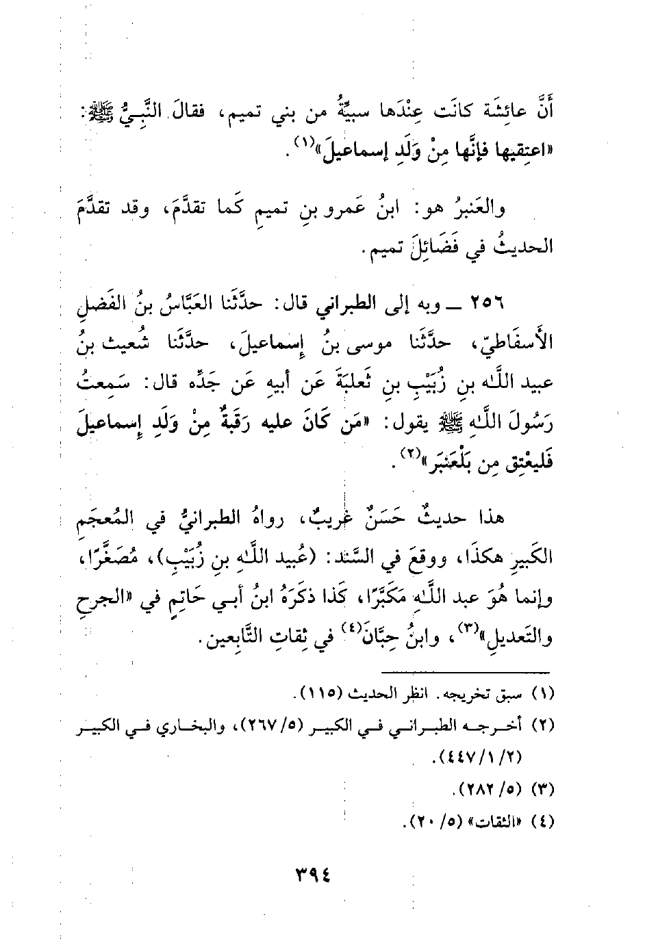 256- وبه إلى الطبراني قال: حدثنا العباس بن الفضل الأسفاطي، حدثنا موسى بن إسماعيل، حدثنا شعيث بن عبيد الله بن زبيب بن ثعلبة عن أبيه عن جده قال: سمعت رسول الله صلى الله عليه وسلم يقول: ((من كان عليه رقبةٌ من ولد إسماعيل فليعتق من بلعنبر)).