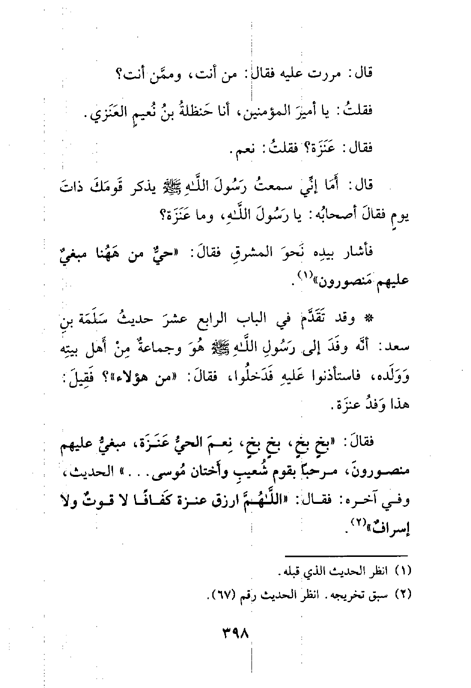 فقال: ((بخٍ بخٍ، بخٍ بخٍ، نعم الحي عنزة، مبغي عليهم منصورون، مرحباً بقوم شعيب وأختان موسى.. .. )) الحديث، وفي آخره: فقال: ((اللهم ارزق عنزة كفافاً لا قوتٌ ولا إسرافٌ)).