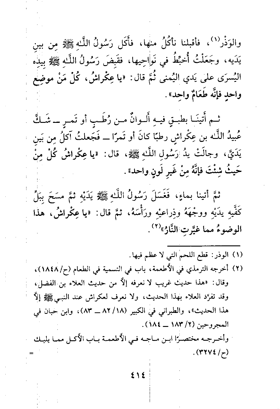 والوذر، فأقبلنا نأكل منها، فأكل رسول الله صلى الله عليه وسلم من بين يديه، وجعلت أخبط في نواحيها، فقبض رسول الله صلى الله عليه وسلم بيده اليسرى على يدي اليمنى ثم قال: ((يا عكراش، كل من موضع واحدٍ فإنه طعامٌ واحد)).