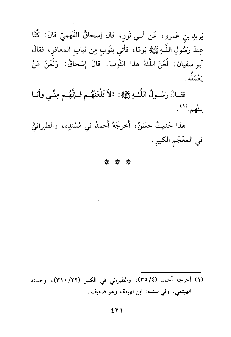 يزيد بن عمرو، عن أبي ثورٍ، قال إسحاق الفهمي قال: كنا عند رسول الله صلى الله عليه وسلم يوماً، فأتي بثوبٍ من ثياب المعافر، فقال أبو سفيان: لعن الله هذا الثوب. قال إسحاق: ولعن من يعمله.