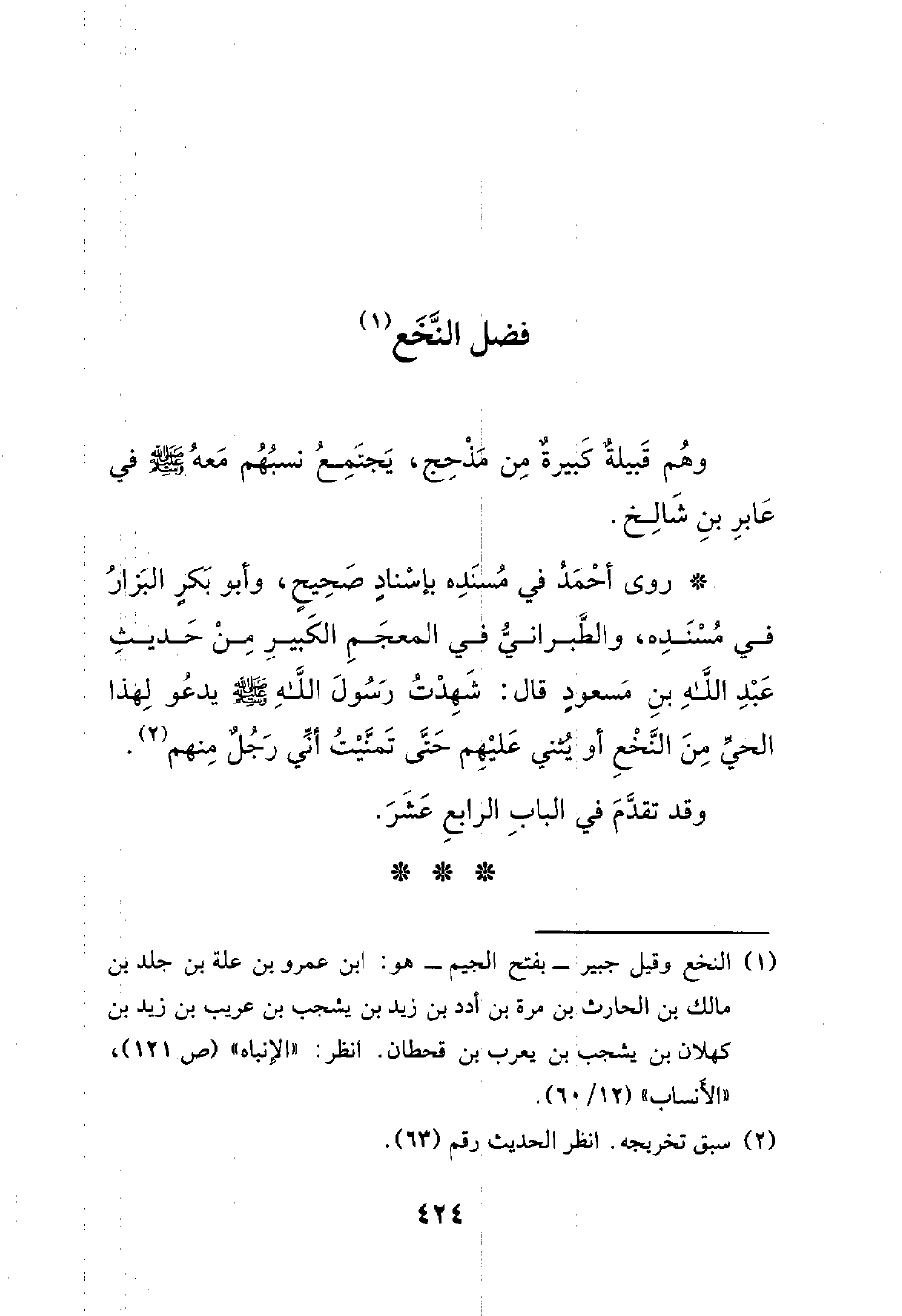 روى أحمد في مسنده بإسنادٍ صحيحٍ، وأبو بكرٍ البزار في مسنده، والطبراني في المعجم الكبير من حديث عبد الله بن مسعودٍ قال: شهدت رسول الله صلى الله عليه وسلم يدعو لهذا الحي من النخع أو يثني عليهم حتى تمنيت أني رجلٌ منهم.