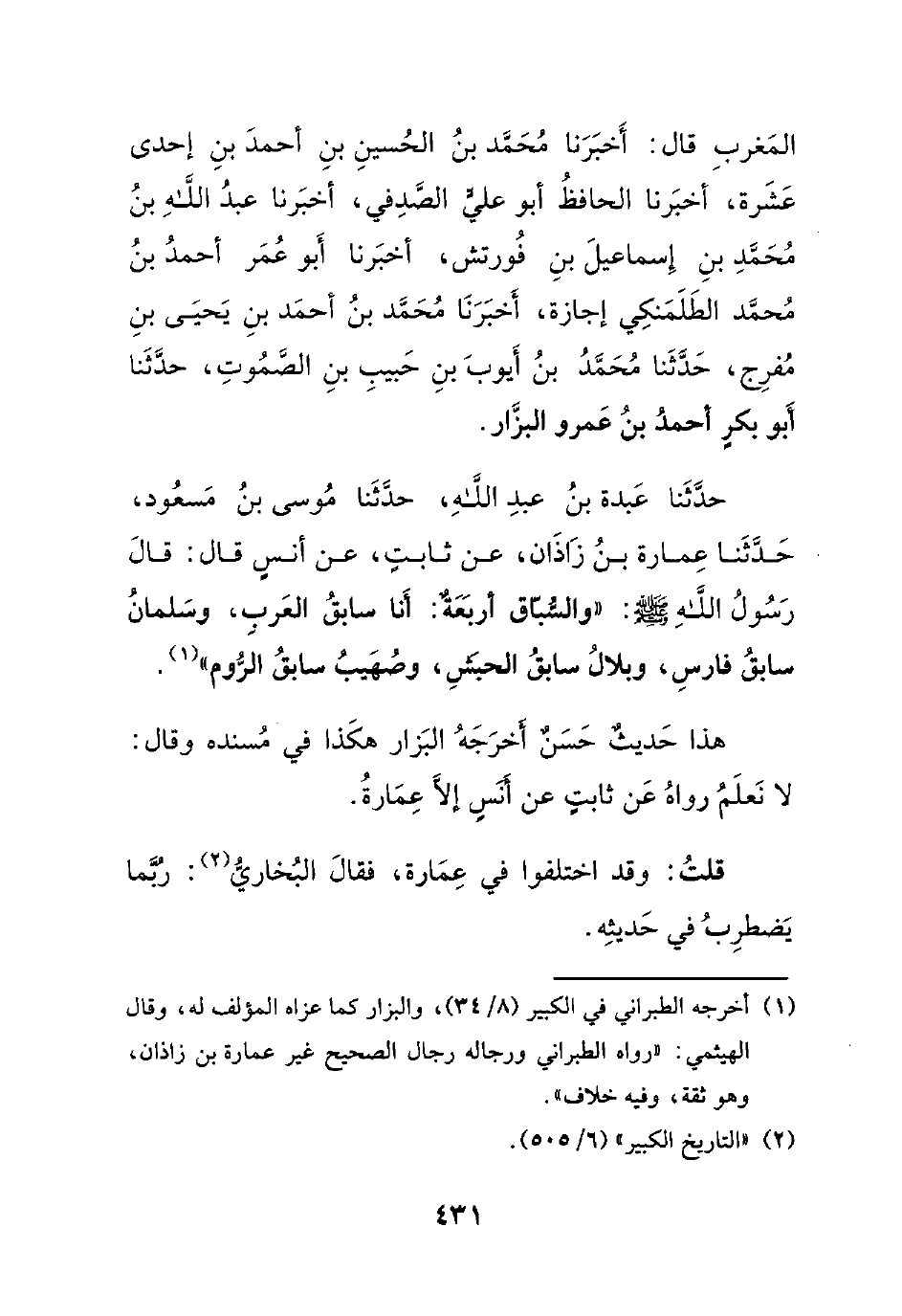 حدثنا عبدة بن عبد الله، حدثنا موسى بن مسعود، حدثنا عمارة بن زاذان، عن ثابتٍ، عن أنسٍ قال: قال رسول الله صلى الله عليه وسلم : ((والسباق أربعةٌ: أنا سابق العرب، وسلمان سابق فارس، وبلال سابق الحبش، وصهيب سابق الروم)).