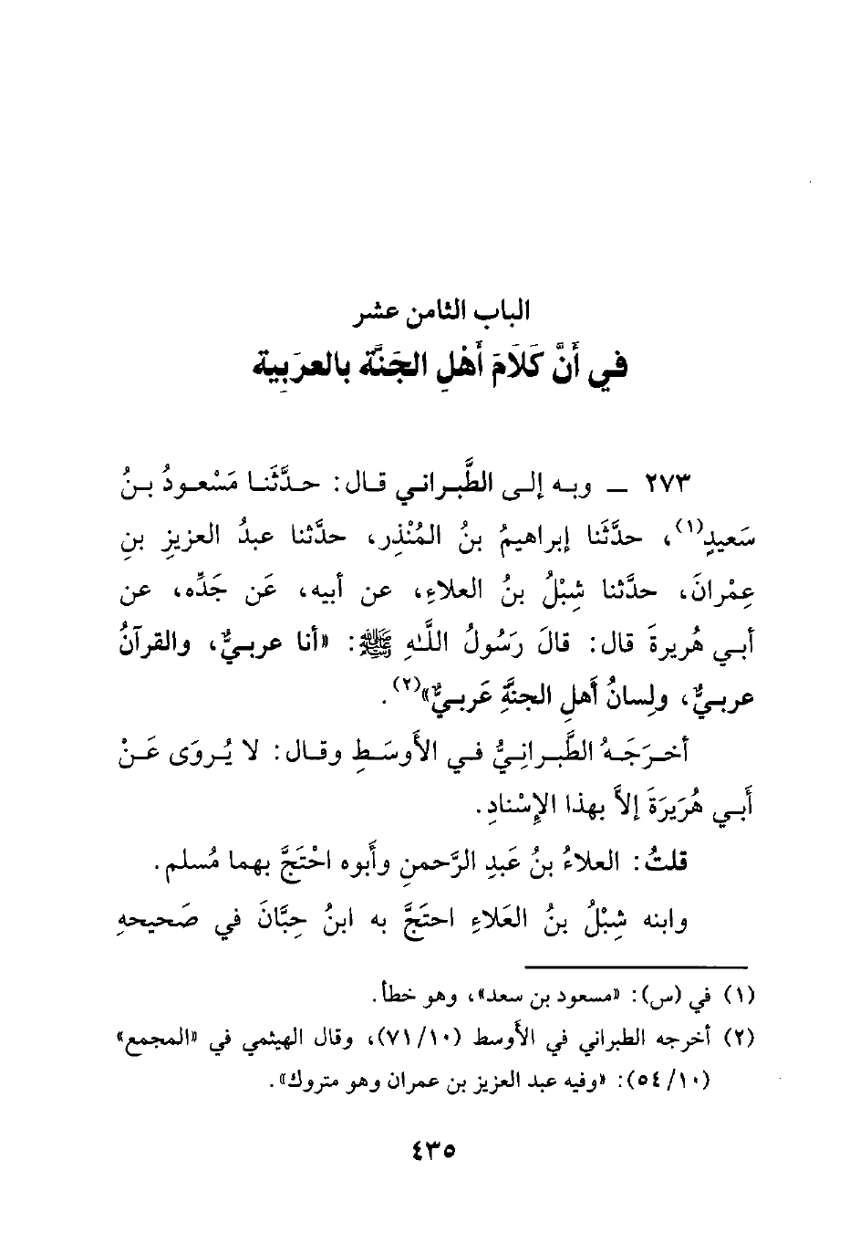 الباب الثامن عشر في أن كلام أهل الجنة بالعربية