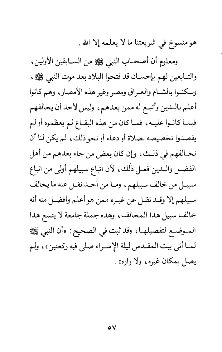 ومعلوم أن أصحاب النَّبِيِّ -صَلَّى اللَّهُ عَلَيْهِ وَسَلَّمَ- السابقين الأولين، والتابعين لهم بإحسانٍ قد فتحوا البلاد بعد موت النَّبِيِّ -صَلَّى اللَّهُ عَلَيْهِ وَسَلَّمَ، وسكنوا بالشام والعراق ومصر وغير هذه الأمصار، وهم كانوا أعلم بالدين, وأتبع له ممن بعدهم، وليس لأحد أن يخالفهم فيما كانوا عليه، فما كان من هذه البقاع لم يعظموه, أو لم يقصدوا تخصيصه بصلاة أو دعاء أو نحو ذلك، لم يكن لنا أن نخالفهم في ذلك، وإن كان بعض مَنْ جاء بعدهم من أهل الفضل والدين فعل ذلك؛ لأن اتباع سبيلهم أولى من اتباع سبيل من خالف سبيلهم، وما من أحد نُقِلَ عنه ما يخالف سبيلهم إلّا وقد نقل عن غيره ممن هو أعلم وأفضل منه أنه خالف سبيل هذا المخالف، وهذه جملة جامعة لا يتسع هذا الموضع لتفصيله، وقد ثبت في الصحيح: "أَنَّ النَّبِيَّ -صَلَّى اللَّهُ عَلَيْهِ وسلم- لما أتى بيت المقدس ليلة الإسراء صلّى فيه ركعتين"، ولم يصل بمكان غيره، ولا زاره".