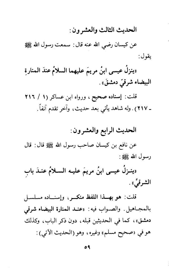 عن نافع بن كيسان صَاحِبَ رَسُولِ اللَّهِ -صَلَّى اللَّهُ عليه وسلم- قَالَ: قَالَ رَسُولُ اللَّهِ -صَلَّى الله عليه سلم: "ينزلُ عيسى ابنُ مريم -عليه السلامُ- عند بابِ الشرقي".
