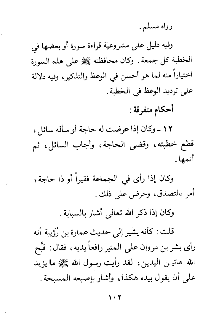 12 - وكان إذا عرضت له حاجة أو سأله سائل قطع خطبته وقضى الحاجة وأجاب السائل ثم أتمها.