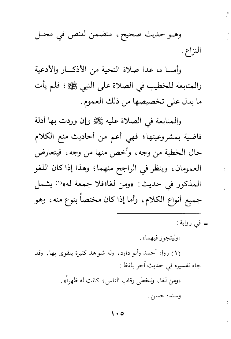 والمتابعة في الصلاة عليه صلى الله عليه وسلم وإن وردت بها أدلة قاضية بمشروعيتها فهي أعم من أحاديث منع الكلام حال الخطبة من وجه وأخص منها من وجه فيتعارض العمومان وينظر في الراجح منهما وهذا إذا كان اللغو المذكور في حديث: "ومن لغا فلا جمعة له" 1 يشمل جميع أنواع الكلام وأما إذا كان مختصا بنوع منه وهو