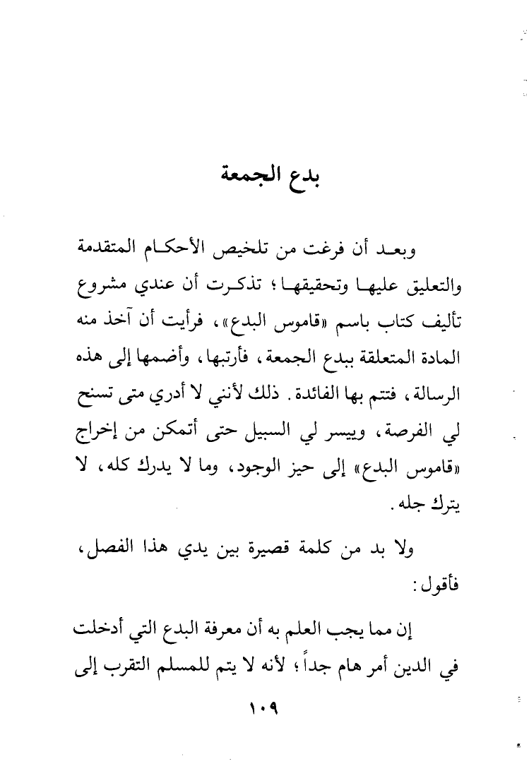 وبعد أن فرغت من تلخيص الأحكام المتقدمة والتعليق عليها وتحقيقها تذكرت أن عندي مشروع تأليف كتاب باسم "قاموس البدع" فرأيت أن آخذ منه المادة المتعلقة ببدع الجمعة فأرتبها وأضمها إلى هذه الرسالة فتتم بها الفائدة. ذلك لأنني لا أدري متى تسنح لي الفرصة وييسر لي السبيل حتى أتمكن من إخراج "قاموس البدع" إلى حيز الوجود وما لا يدرك كله لا يترك جله