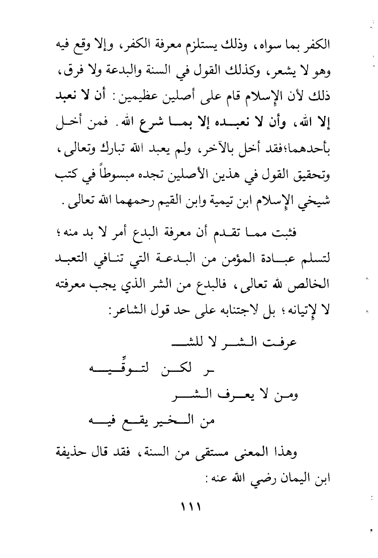 الكفر بما سواه وذلك يستلزم معرفة الكفر وإلا وقع وهو لا يشعر وكذلك القول في السنة والبدعة ولا فرق ذلك لأن الإسلام قام على أصلين عظيمين: