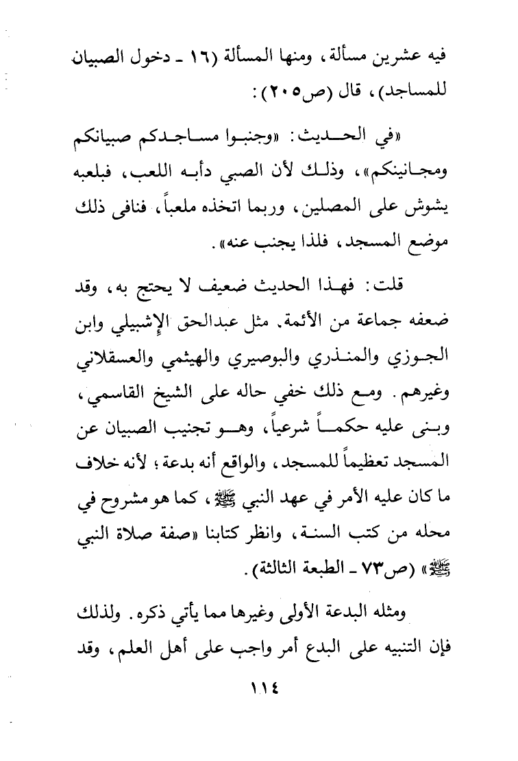 فيه عشرين مسألة ومنها المسألة "16: دخول الصبيان للمساجد" قال "ص 205":