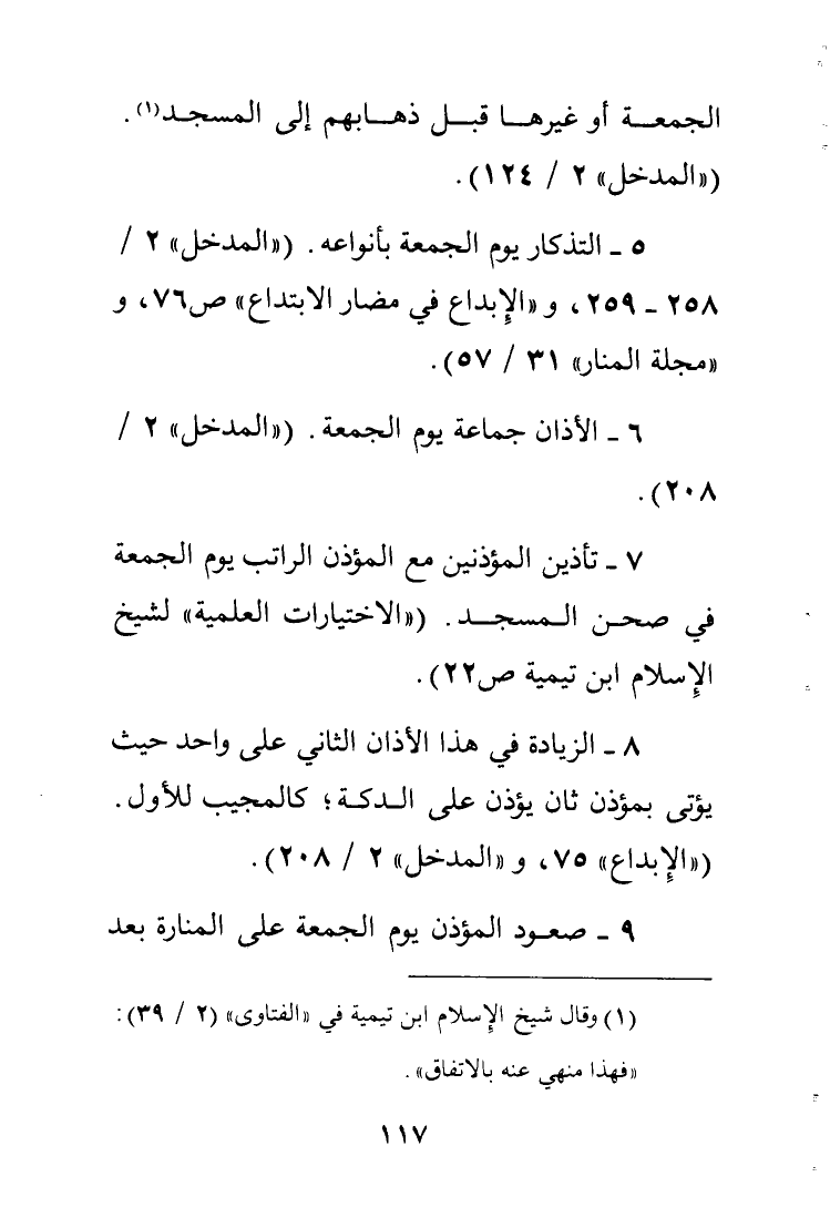5 - التذكار يوم الجمعة بأنواعه. ""المدخل" 2/258 - 259 و"الإبداع في مضار الابتداع" ص 76" ومجلة المنار "31/57"